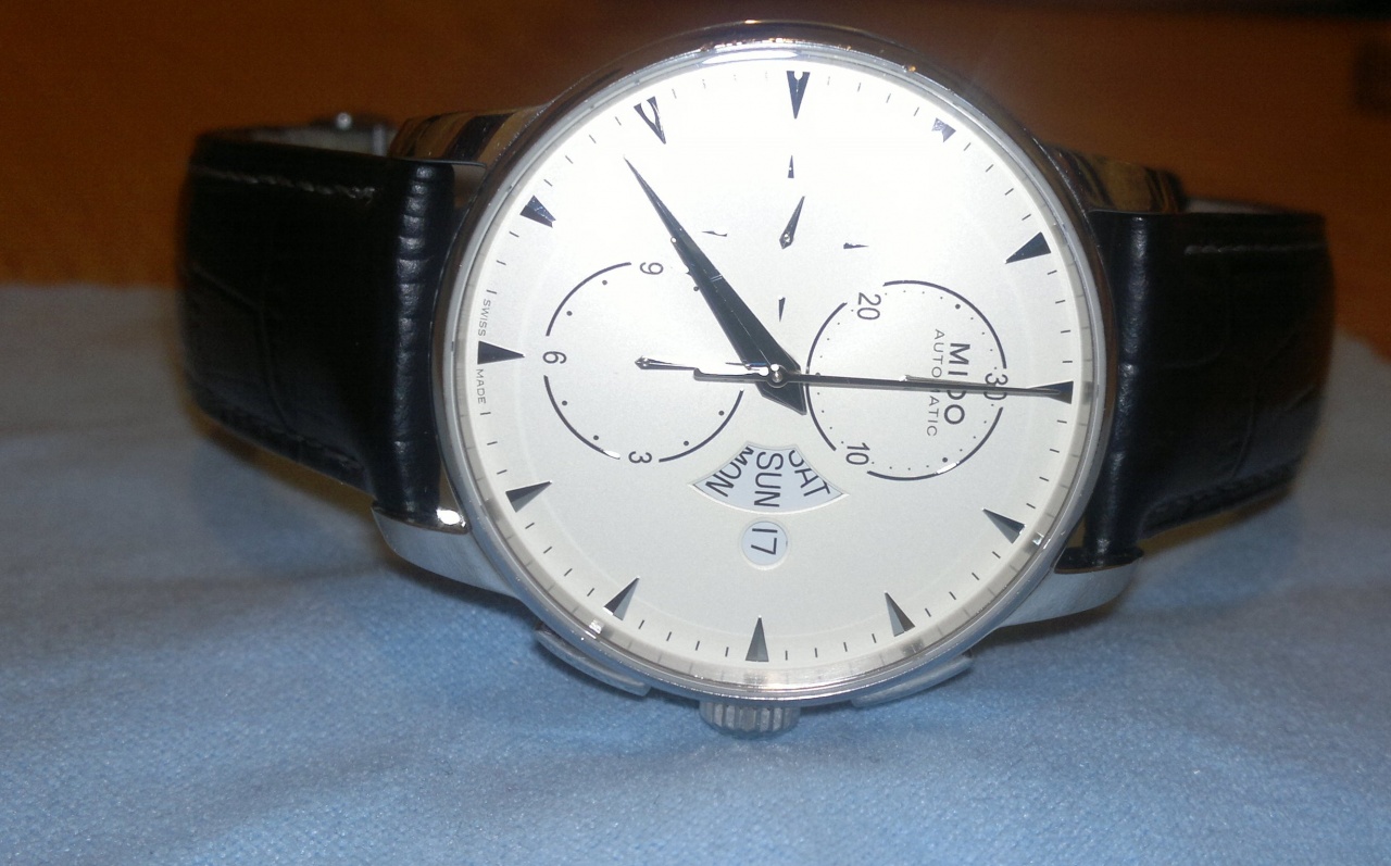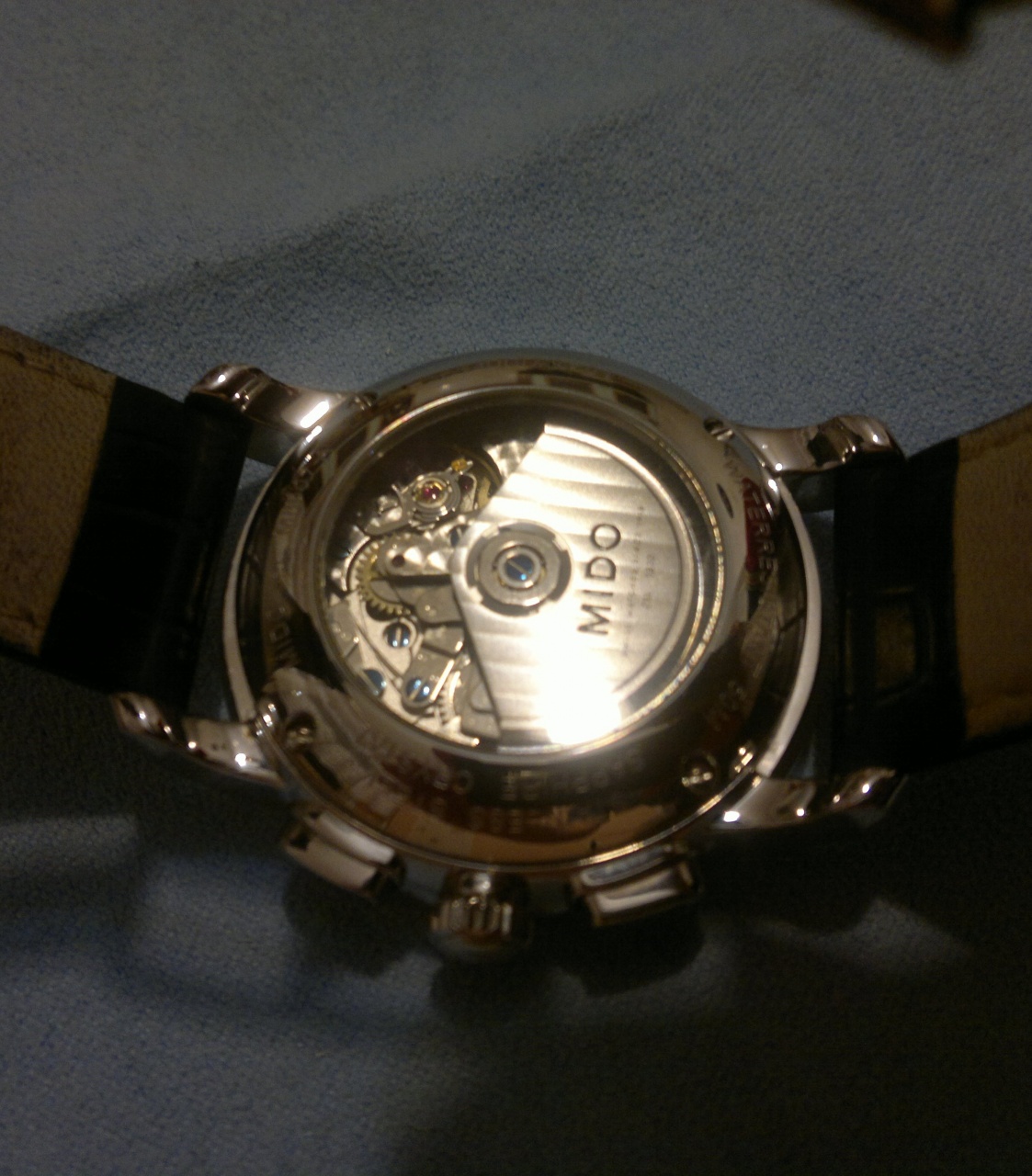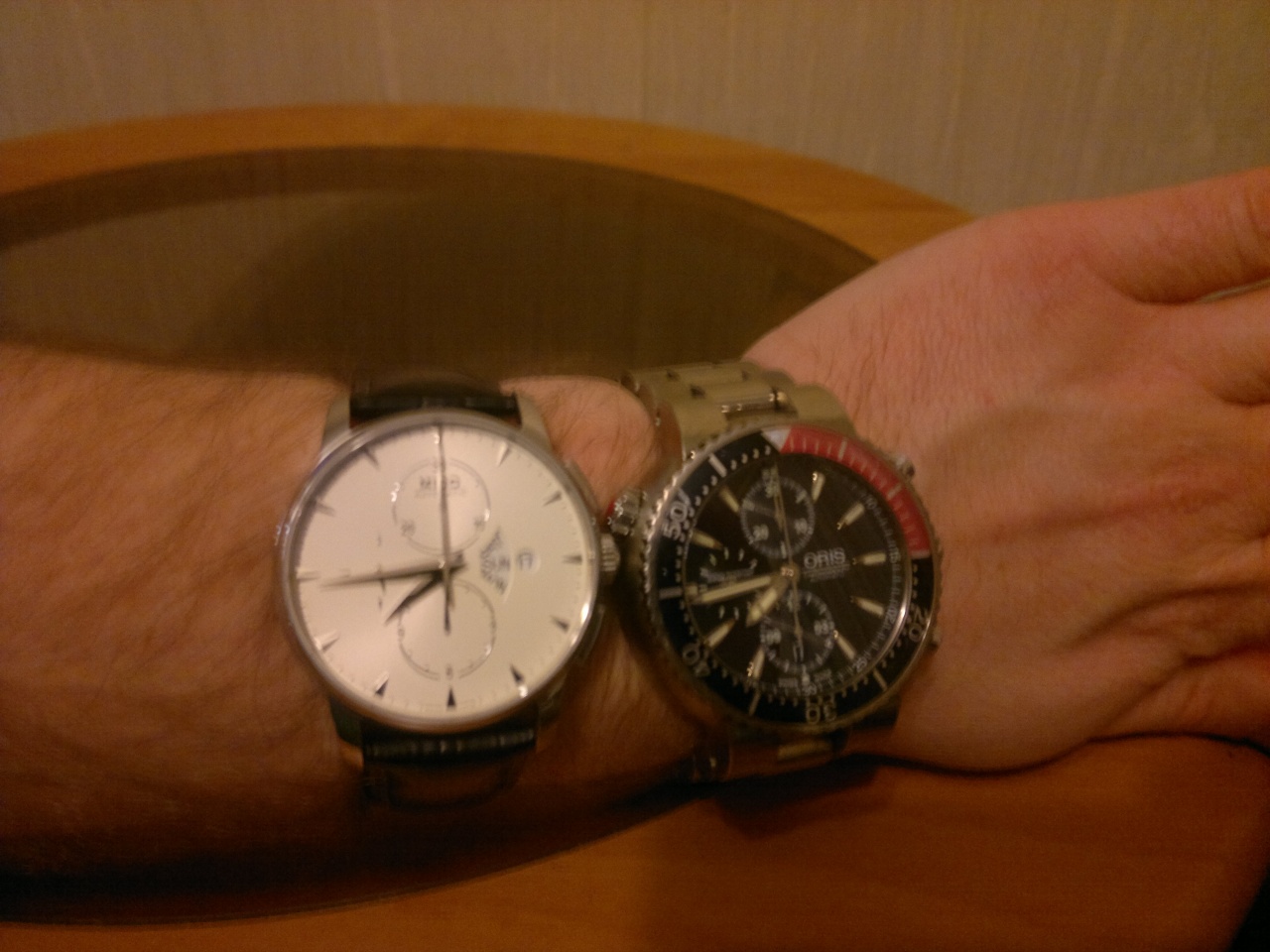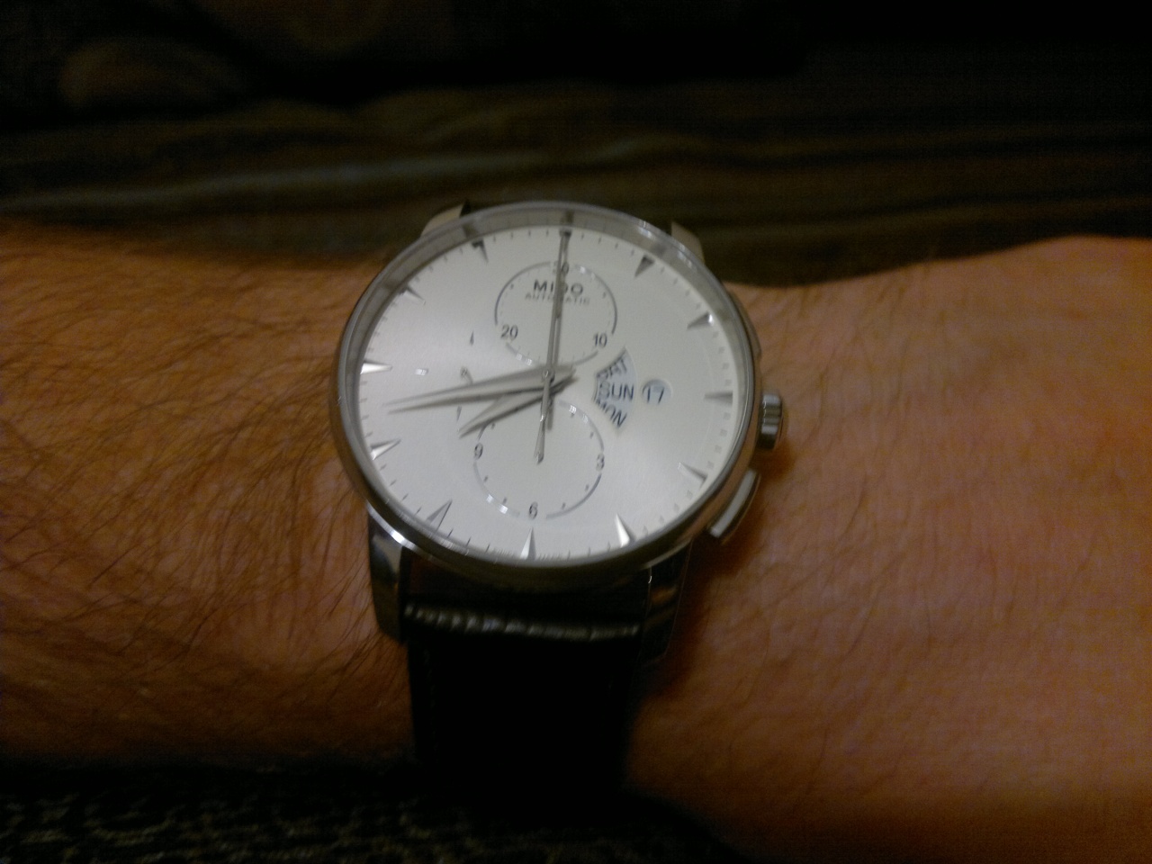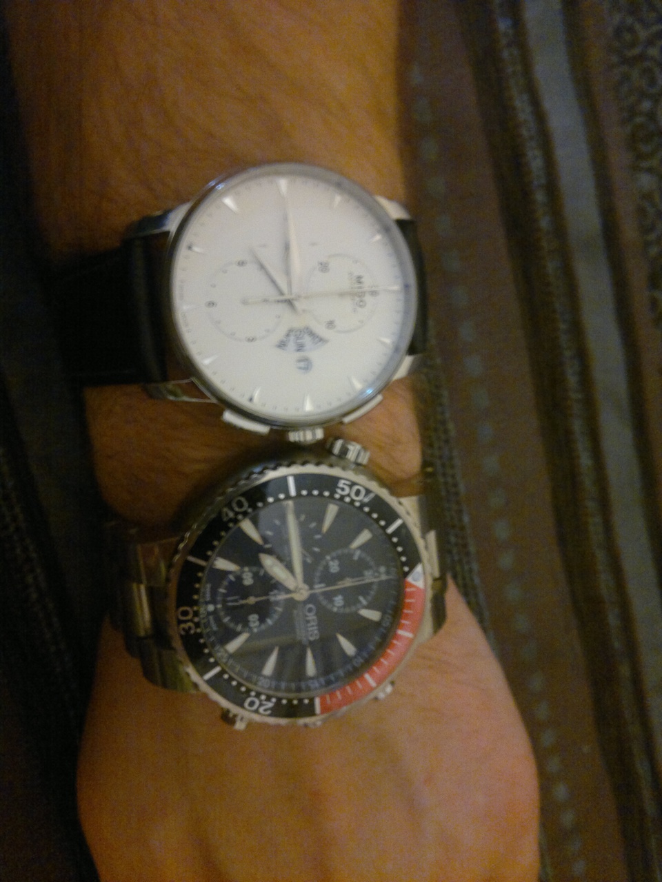 [Продам или обменяю красивый, элегантный хронограф MIDO Baroncelli II Automatic Chronograph на базе 7750. Корпус 42 мм, но выглядят больше (смотрите фото на одной руке с Oris 47mm) водонепроницаемый до 50 метров. Полный магазинный комплект. Состояние очень хорошее, ход точный +5 с\сутки. Носились как костюмный вариант и достаточно редко. Рифленая заводная головка расположена на 3 часах, прямоугольные пушеры хронографа - на 2 и 4 часах. Сапфировое стекло установлено на передней стороне корпуса (с двусторонним антибликовым покрытием) и на его задней крышке. Циферблат серебристого-молочного цвета, с накладными часовыми индексами, дафино стрелками.