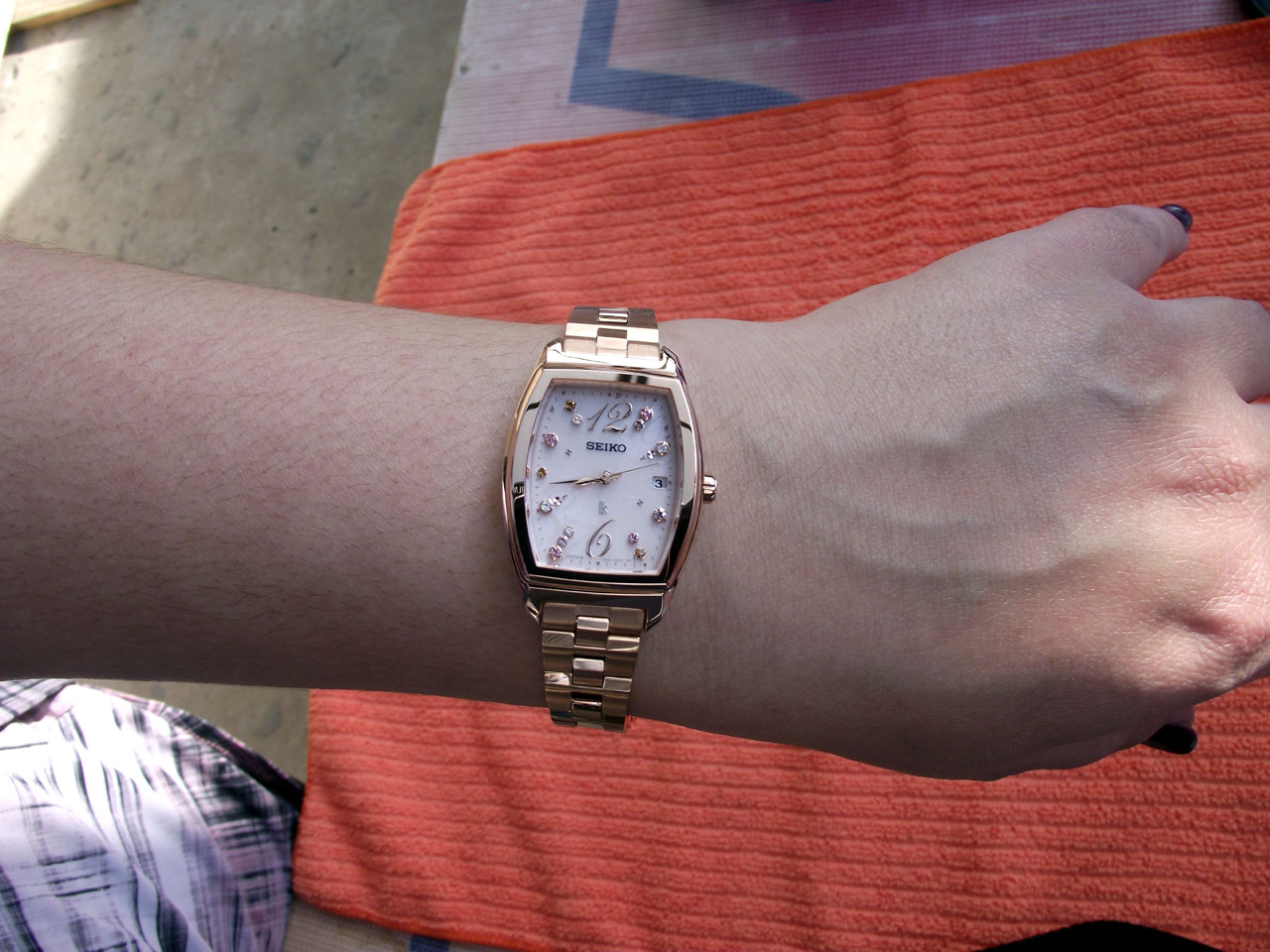 Собственно для супруги выбираем изящные часики с позолотой, выбор пока остановился на Seiko SSVW042 (сапфир, радиосинхронизация в том числе из Германии, размер 37x24x9mm, элементы Сваровски)
