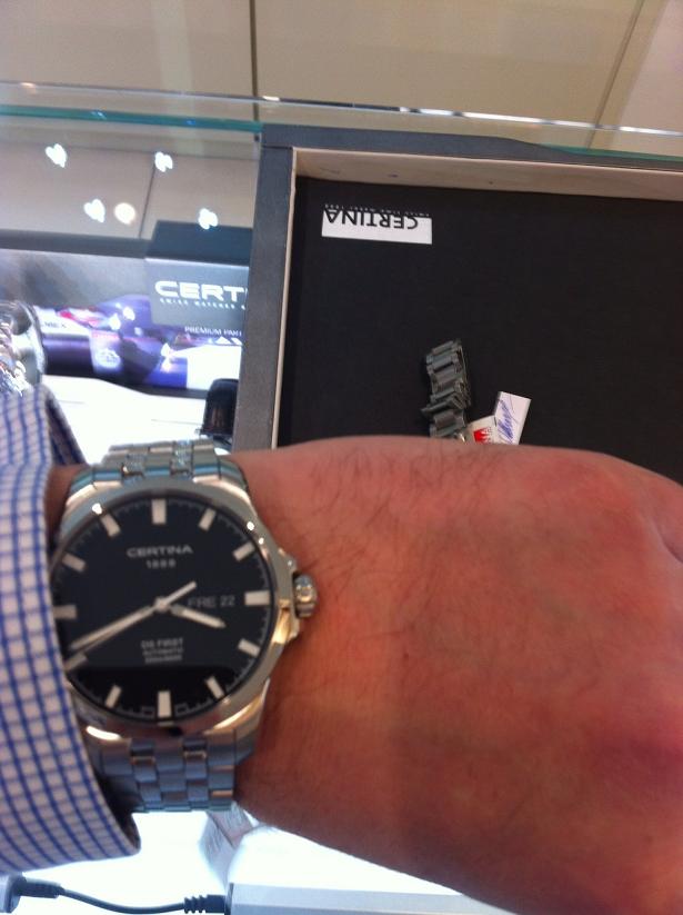Сертина ДС Родиум Автоматик - аккуратный хронограф, вот фото моих часов (заказывал и получал сам ЗА ГРАНИЦЕЙ, для 100% гарантии подлинности), считаю что с браслетом светлый циферблат смотрится лучше, как единое целое :