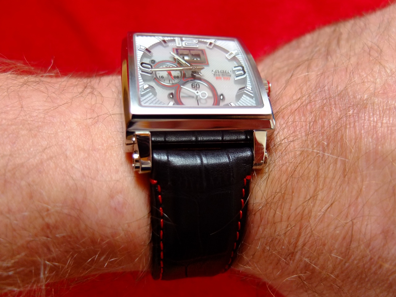 Приветствую всех,друзья!Волею случая,недавно приобрел сей экземпляр.Обзоры круглых моделей на этом калибре,Е3100,уже есть на форуме.Представляю вам квадратную версию.Когда я видел эти часы на картинке,это одно,а вот вживую часы впечатляют гораздо сильнее.Габариты корпуса 38 х 38 мм.,толщина 14мм,ширина ремня 26мм.,стекло сапфир с внутренним антибликом.В общем,часы смотрятся богато,стильно,но понятное дело,на любителя и не на всякую руку их размер.Вот фото.
