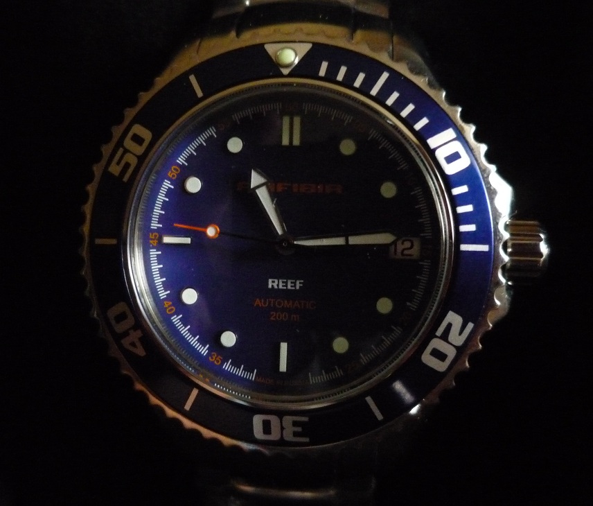 На синем Рифе ,полностью рыжая стрелка возможно пришлась бы к месту ... Хотя тут при неярком освещении, за счет черной части стрелки возникает иллюзия, что ее кончик движется сам по себе ....Тоже прикольно...