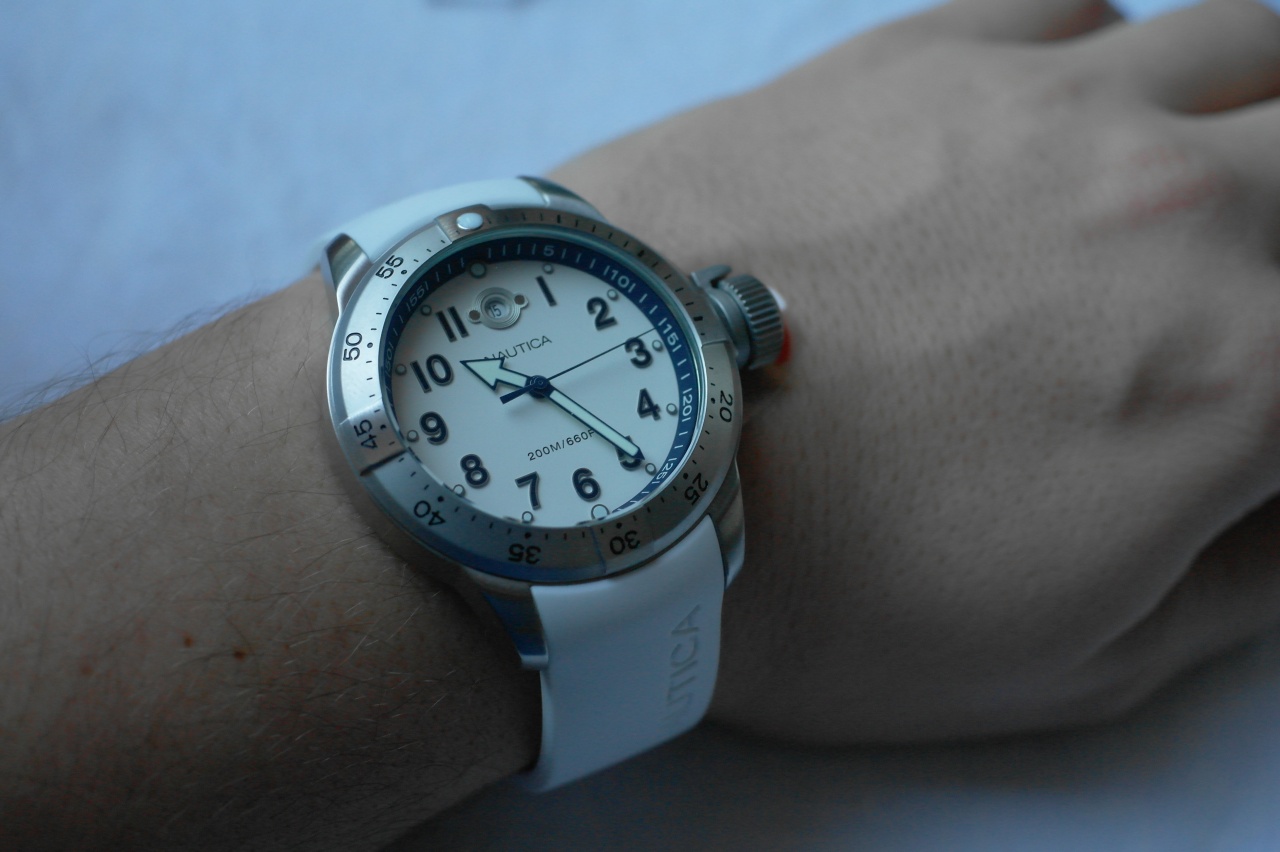 Вращающийся безель снабжён меткой с люминофором, также как и метки на циферблате, часовая и минутная стрелки.