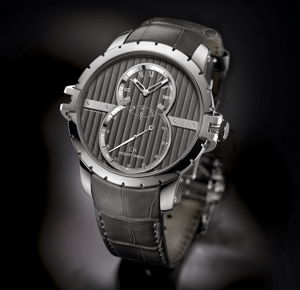 Поставляется на темно-сером ремешке из кожи аллигатора с раскладной застежкой из нержавеющей стали.
