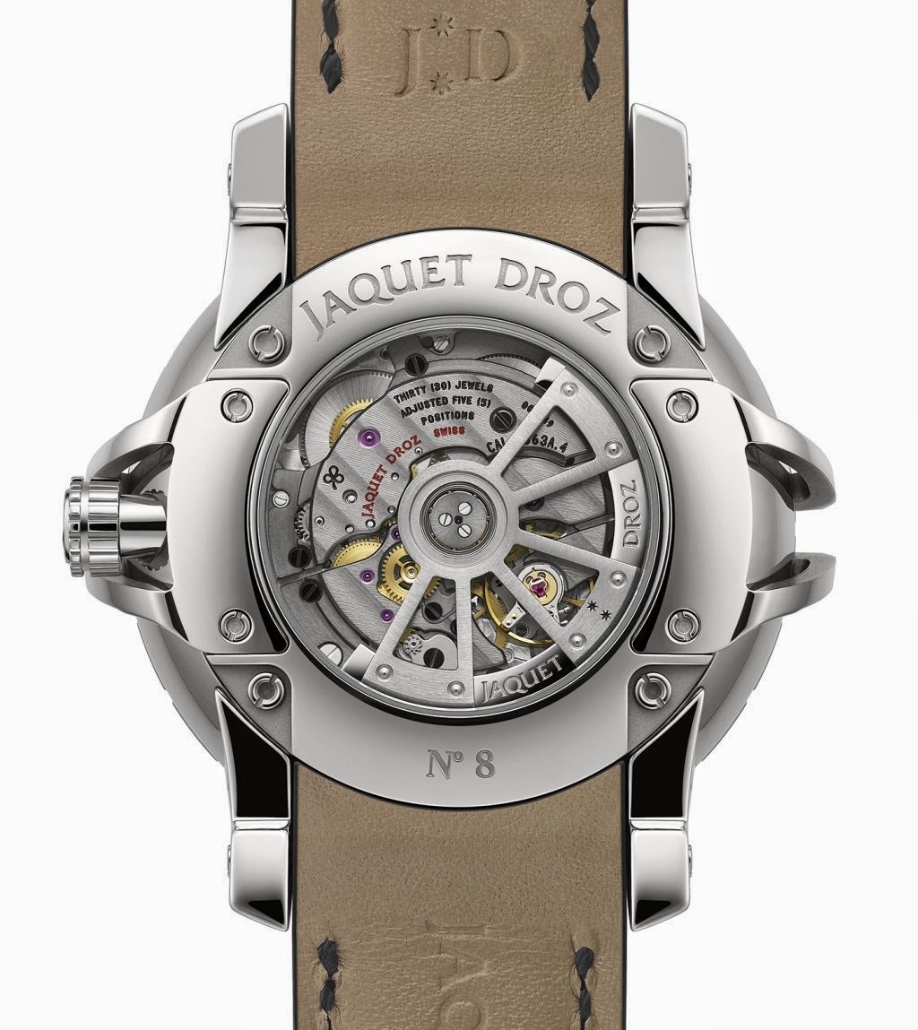 Модель оснащена автоматическим механизмом Jaquet Droz 2663A-S, с рутениевым покрытием, двумя заводными барабанами, ротором автоподзавода из 18-каратного белого золота, на 30 камнях, с балансовой частотой 28800 полуколебаний в час (4 гц), 68-часовым запасом хода, функциями аналоговой индикации часов, минут, секунд.
