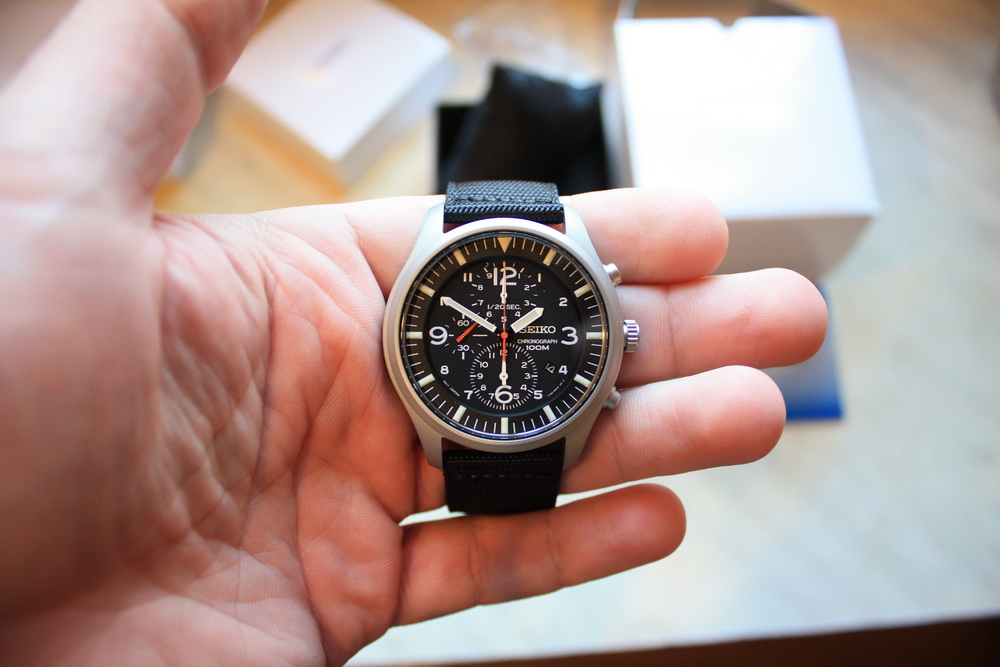 Мужские кварцевые часы. Корпус этих часов крупного размера (44 мм.) и выполнен из нержавеющей стали. Модель SNDA57P1 имеет стекло хардлекс, текстильный ремешок чёрного цвета, чёрный циферблат. Водоустойчивость: 100 метров. Дополнительные функции и особенности: дата, хронограф. Полная заводская комплектация Seiko