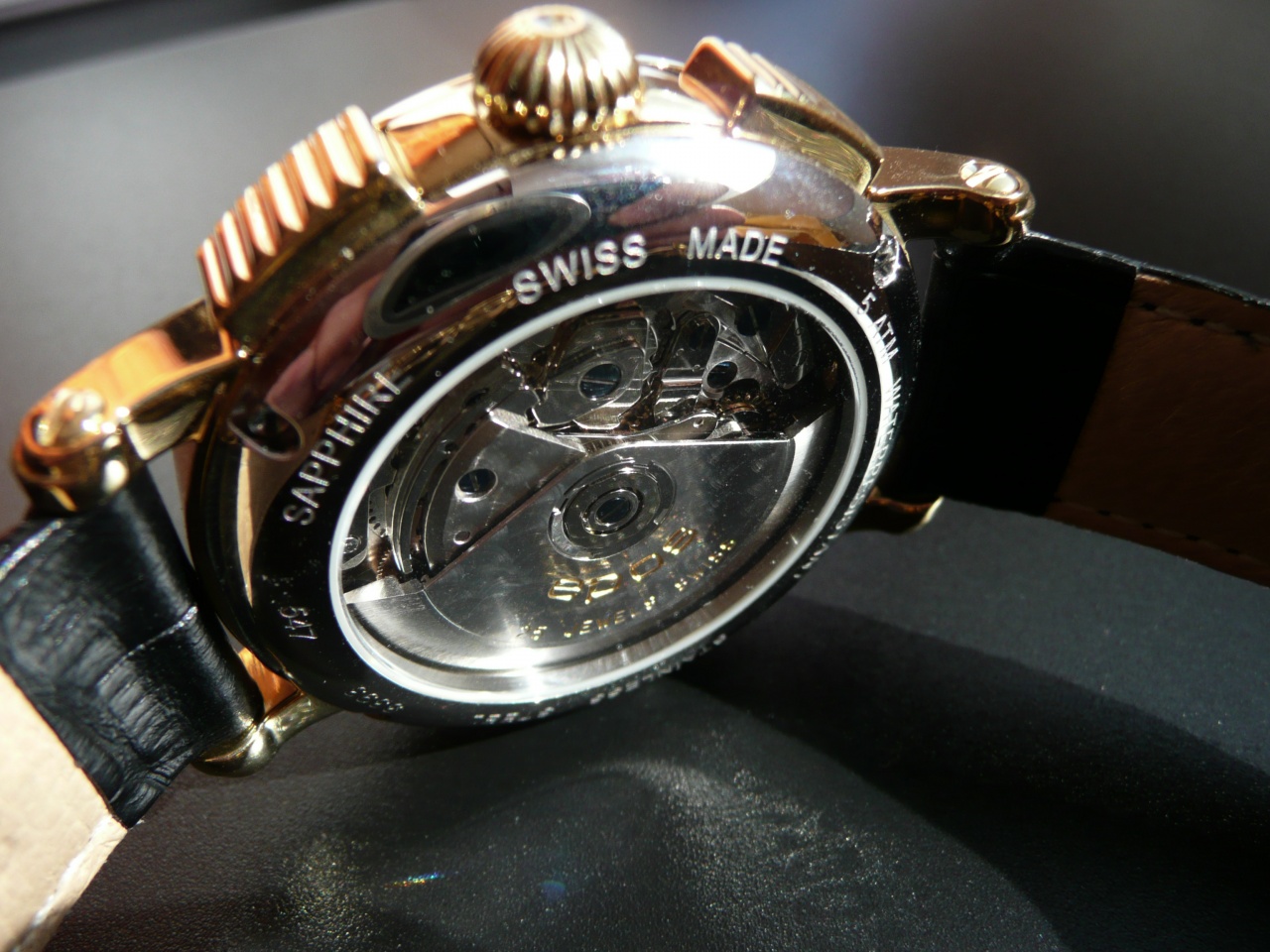 Механизм Valjoux 7751 хронограф с автоподзаводом (Automatic Chronograph); 25 камней; 28800 полуколебаний/час; запас хода 44 часа; обод баланса Glucydur; спираль баланса Nivarox; противоударное устройство оси баланса Incabloc; стрелки и индикаторы: часы, минуты, секунды, хронограф (часы, минуты, секунды), дополнительная 24 - часовая шкала, месяц, число месяца, день недели, указатель фазы луны. • Корпус из высококачественной нержавеющей стали со стойким PVD покрытием. • Сапфировое стекло устойчивое к царапанию. • Светонакопительный состав на стрелках и маркерах часа. • Кожаный ремешок. • Водозащита до 5 АТМ.