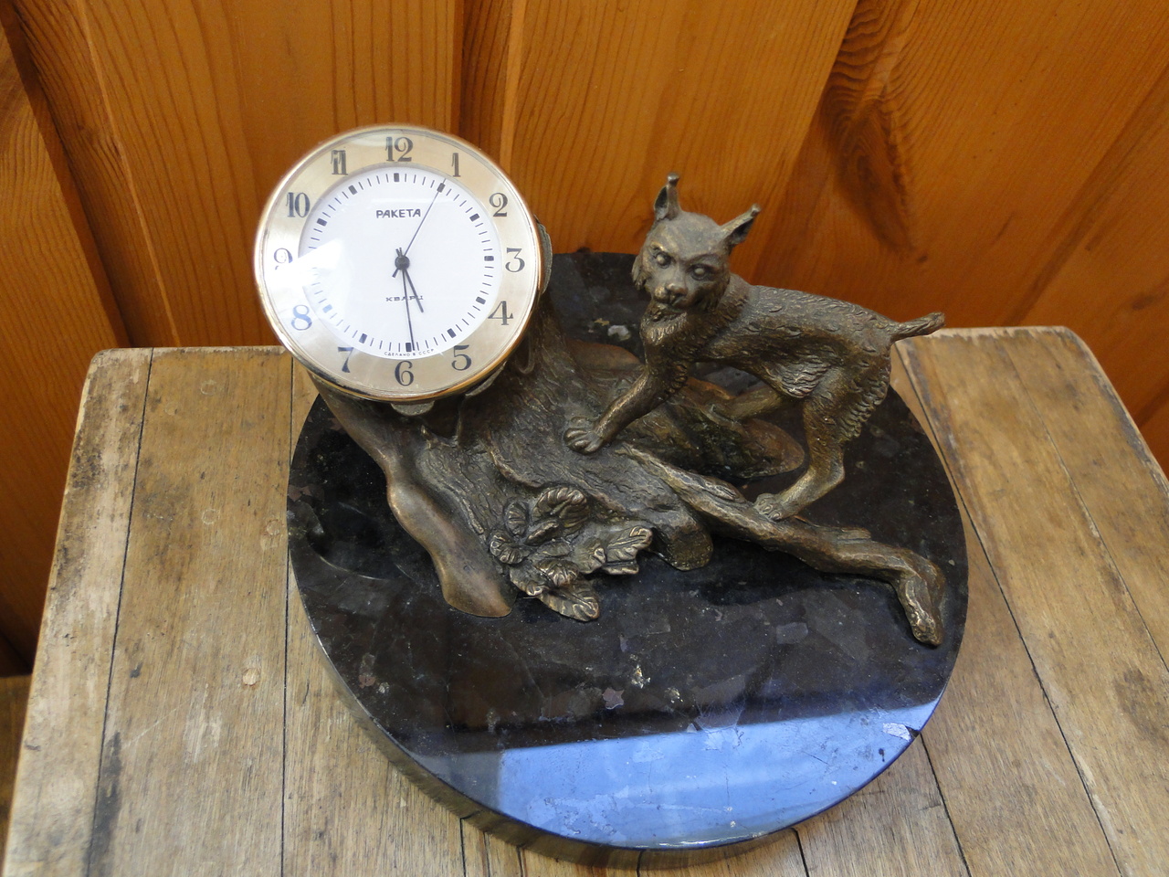 Настольные кварцевые часы Ракета Петродворцового Часового Завода второй половины 1980-х годов. Циферблат белого цвета. Фигуры рыси и пня бронзовые. Подставка каменная, изготовлена из змеевика. Размеры 15x8,5x9 см. Механизм-2356. На данный момент это единственный известный экземпляр этих часов.