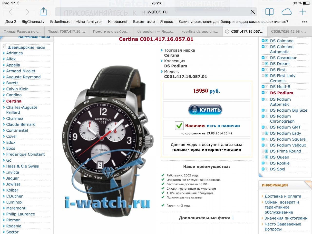 присоединяюсь к подиум биг сайз. также советую обратить внимание на серию DS Action. являюсь обладателем 2 certina. качество хорошее, дизайн более сдержанный чем в Тиссо, ну и марка не такая попсовая. например посмотрите вот http://www.klockia.se/certina-ds-act...11-057-00.html покупать лучше тут, так как они доставляют в Россию и делают вычет НДС сразу