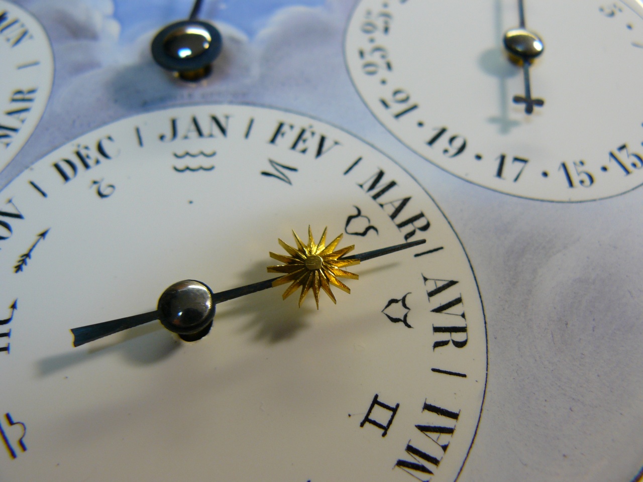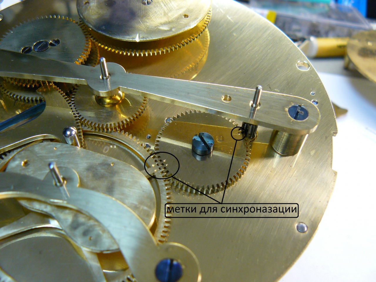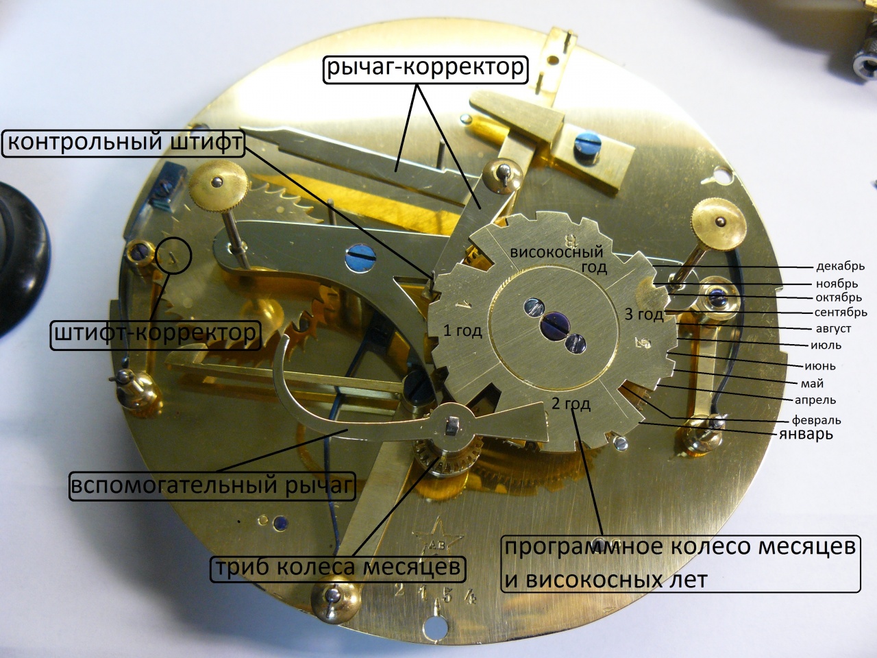 программное колесо, колесо месяцев и колесо дат должны быть четко синхронизированы между собой, поэтому на них имеются синхронизационные метки, как на колесах ГРМ в двигателе внутреннего сгорания