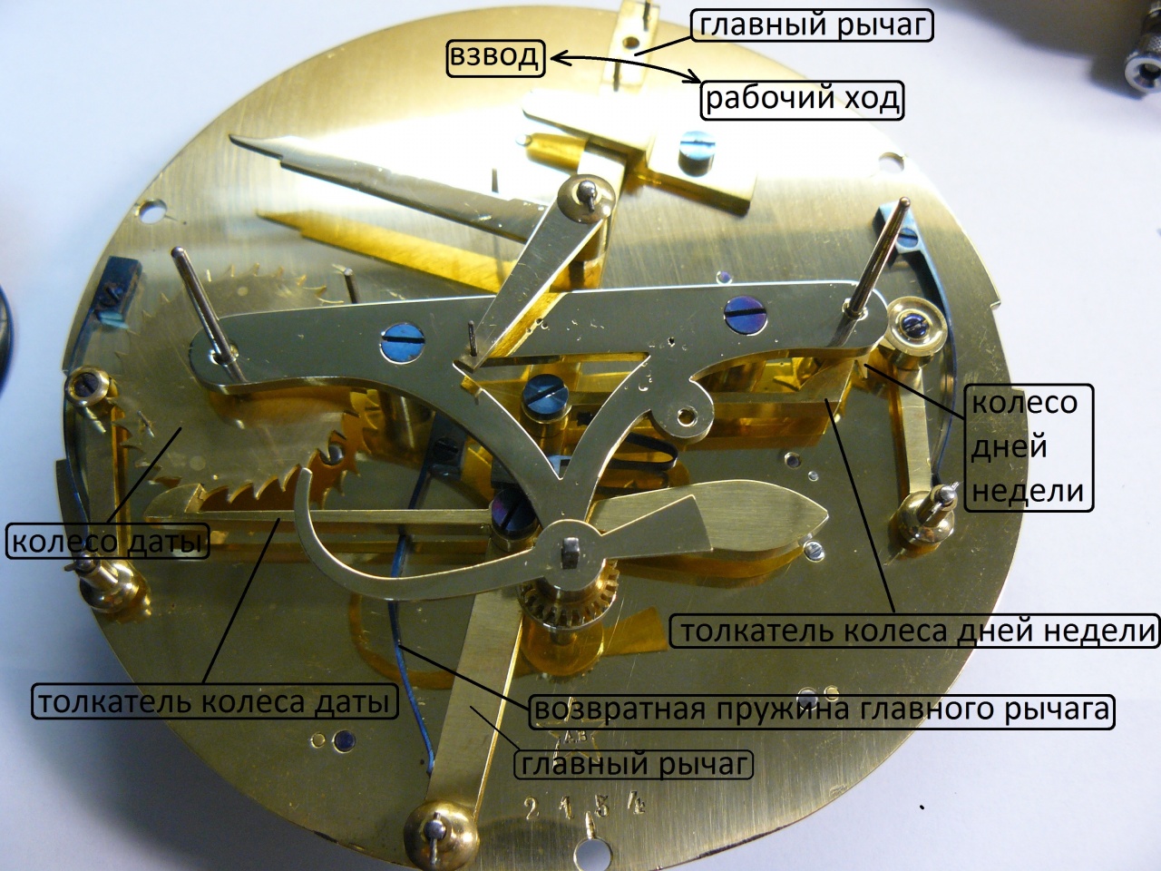 вращательное движение диска привода календаря преобразуется в поступательное движение главного рычага, которое вновь преобразуется в вращательное движение колес даты и дня недели