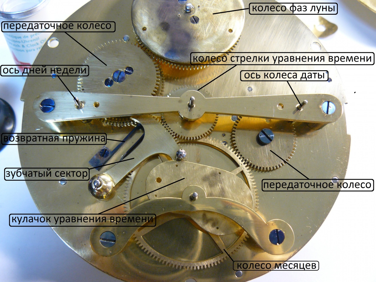 колесо месяцев делает 1 оборот в год, зубчатый сектор скользя своим штифтом по боковой поверхности кулачка, приводит в движение колесо стрелки уравнения времени