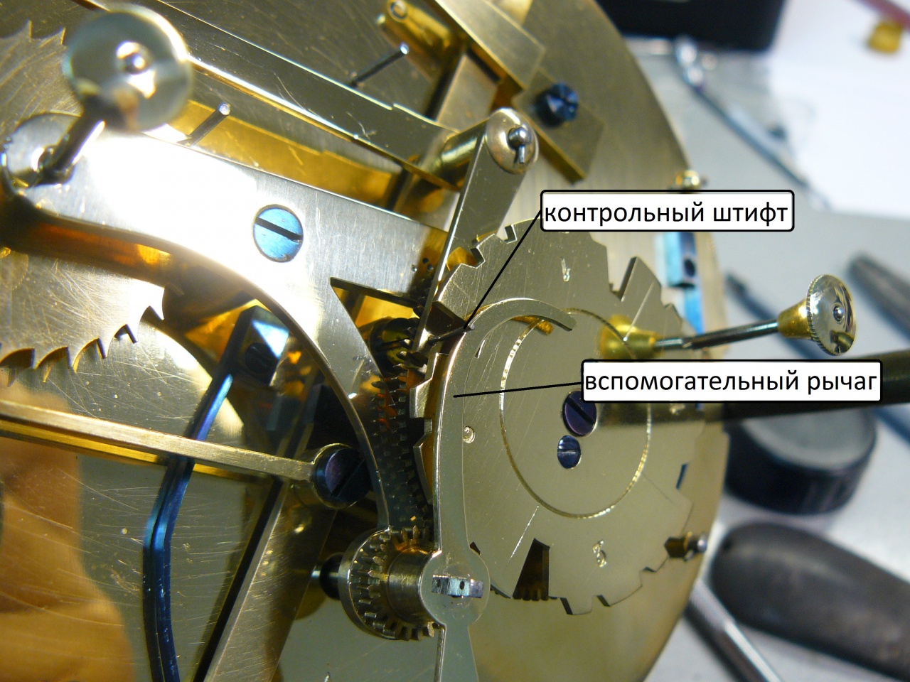как раз, когда вспомогательный рычаг поднимает штифт рычага-корректора, проходит Март, и контрольный штифт падает сразу в вырез Апреля