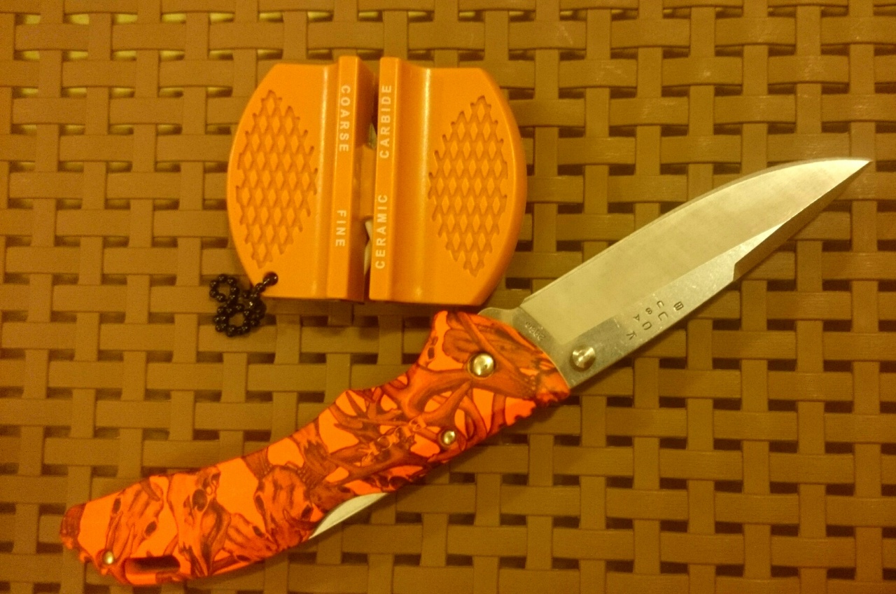 Но не удержался и купил оранжево-камуфдяжный Buck, несмотря на то, что точно такой, но черный, уже давно в пользовании( это его я точил точилкой Fiskars). Заодно и точилку другую купил, подозреваю, что подвергнусь остракизму, но она(точилка) ни разу не Lansky