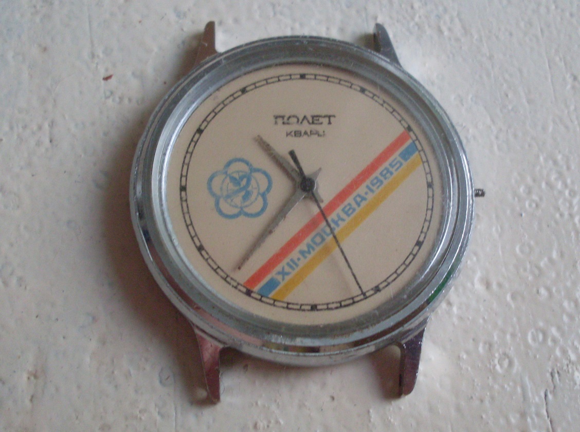 дело не в часах... набейте в Яндексе запрос "Москва 85", в фестивальной тематике утонете без преувеличения... Эта эмблема, да еще Катюша... с ними выпускалось все...вплоть до семейных трусов.. чуть ранее еще круче была истерия совпромышленности с этим вот косолапым