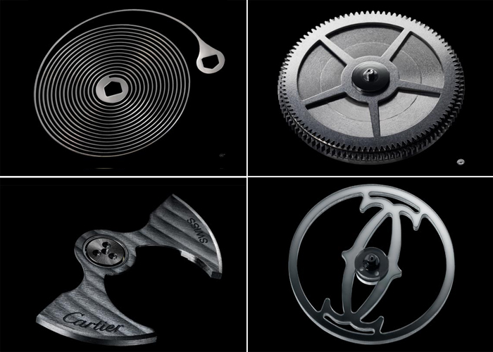 Пружина баланса – церодур: стеклянная керамика абсолютно не чувствительная к магнитному полю, устойчивая к перепаду температур. Колесо баланса – карбон (прочный подобно алмазу, сплошной материал, достаточно неоднороден для того, чтобы обеспечить свободный доступ масла в спусковой механизм). На ротор из карбидо-вольфрама,нанесено DLC (углеродное алмазоподобное покрытие, более темное чем рутениевое, более стойкое ко внешнему воздействию, чем покрытие PVD)