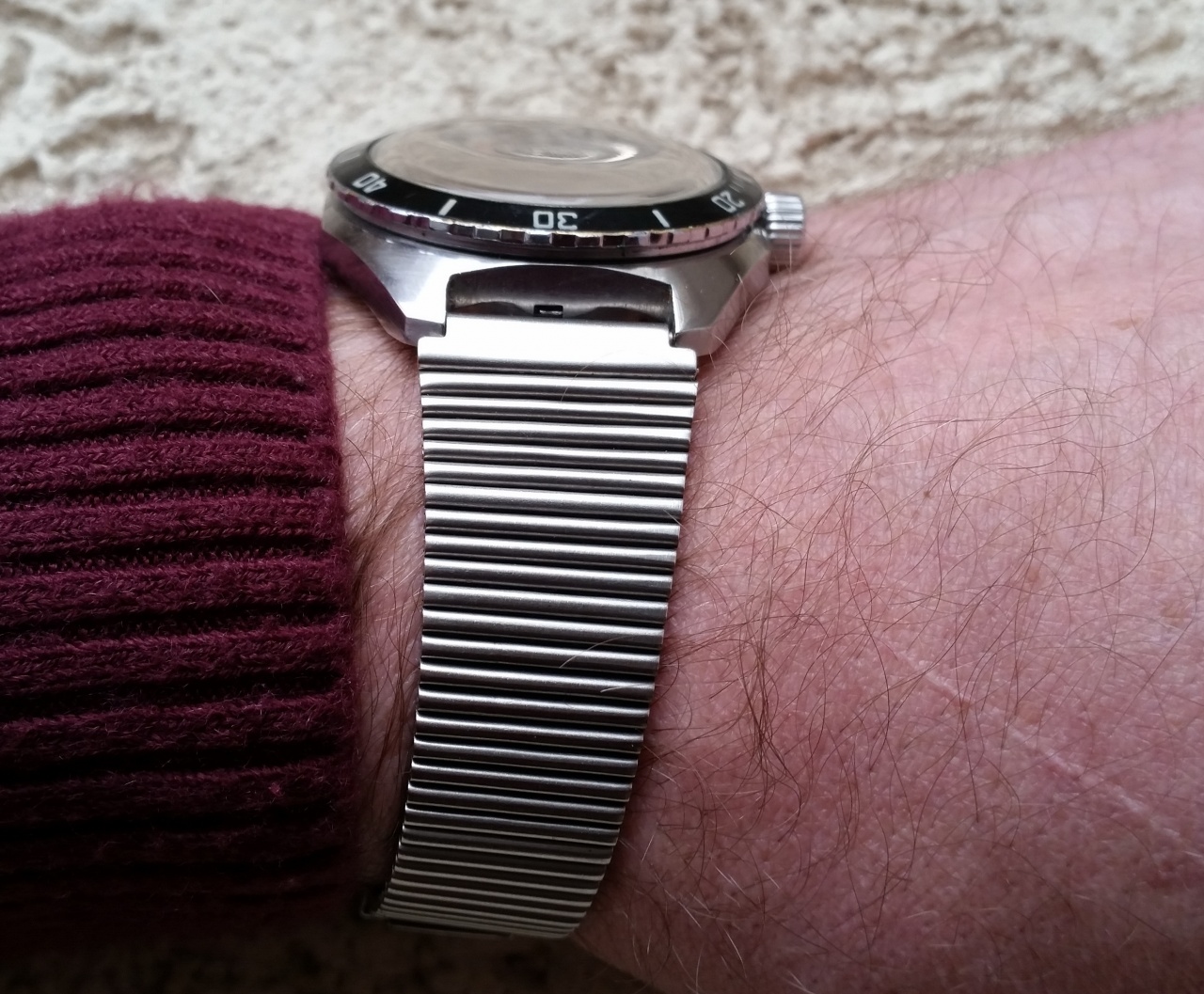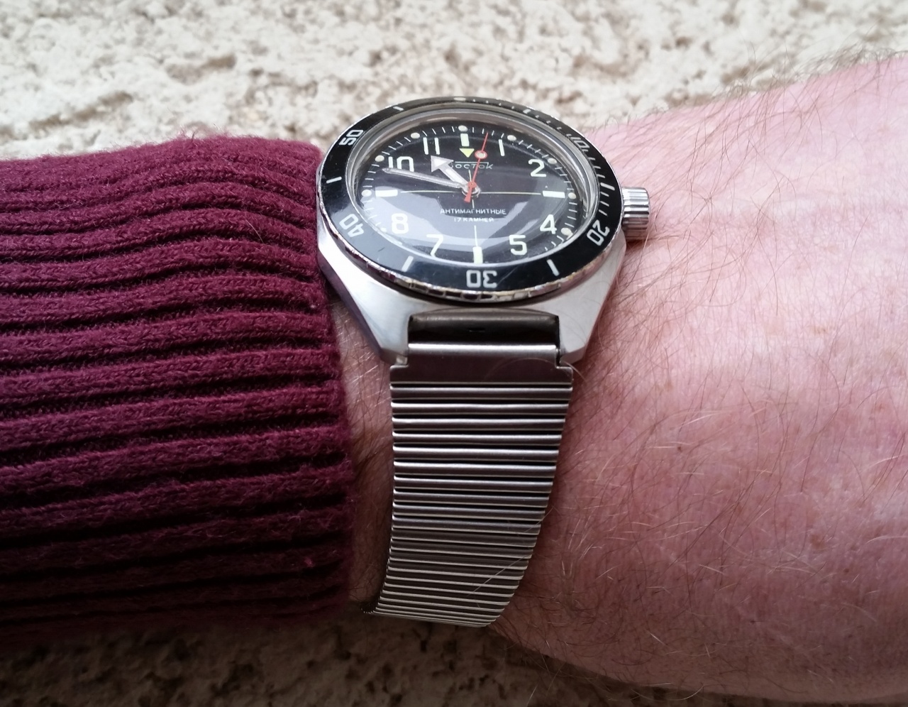 Что-то мы все(включая меня самого ) в импортные браслеты ударились... А вот покажу такой, купил вместе с часами, хотел сменить, затем помыл-почистил и ... прижился. Понравилось.Прочный и гибкий.