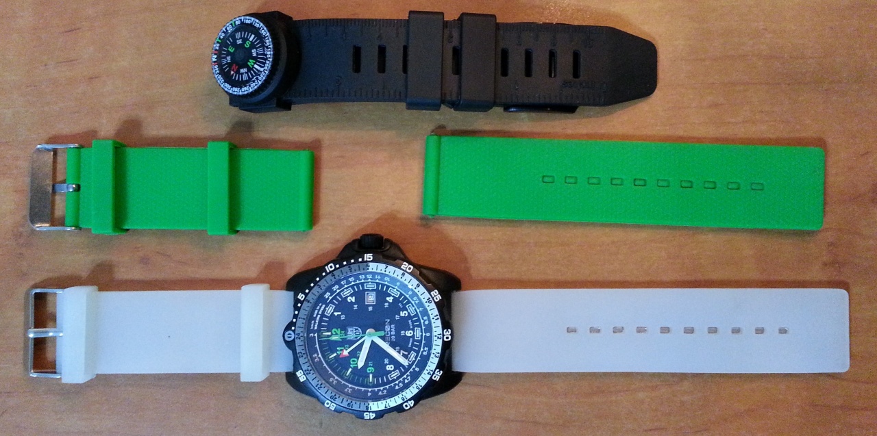 Давно озаботился вопросом запасного ремешка для Люминокса, но родной стоил весьма дорого для куска силикона, стропы только под заказ и цена завышена (в магазинах от 600, а сама стропа со всей фурнитурой в магазине швейных принадлежностей меньше 100). Пошел в мастерскую менять батарейку на Касио и наткнулся там же на оптово-розничную компанию, продают все часовое. Цены мизерные, особенно если сравнивать с часовыми мастерскими, качество хорошее, есть ремни отечественного производства (считаю лучшими по соотношению цена\качество, Нагата рядом не стояла, хотя и Нагата у них есть). Прикупил себе пучок на 24мм, отлично сели на мои 23мм:
