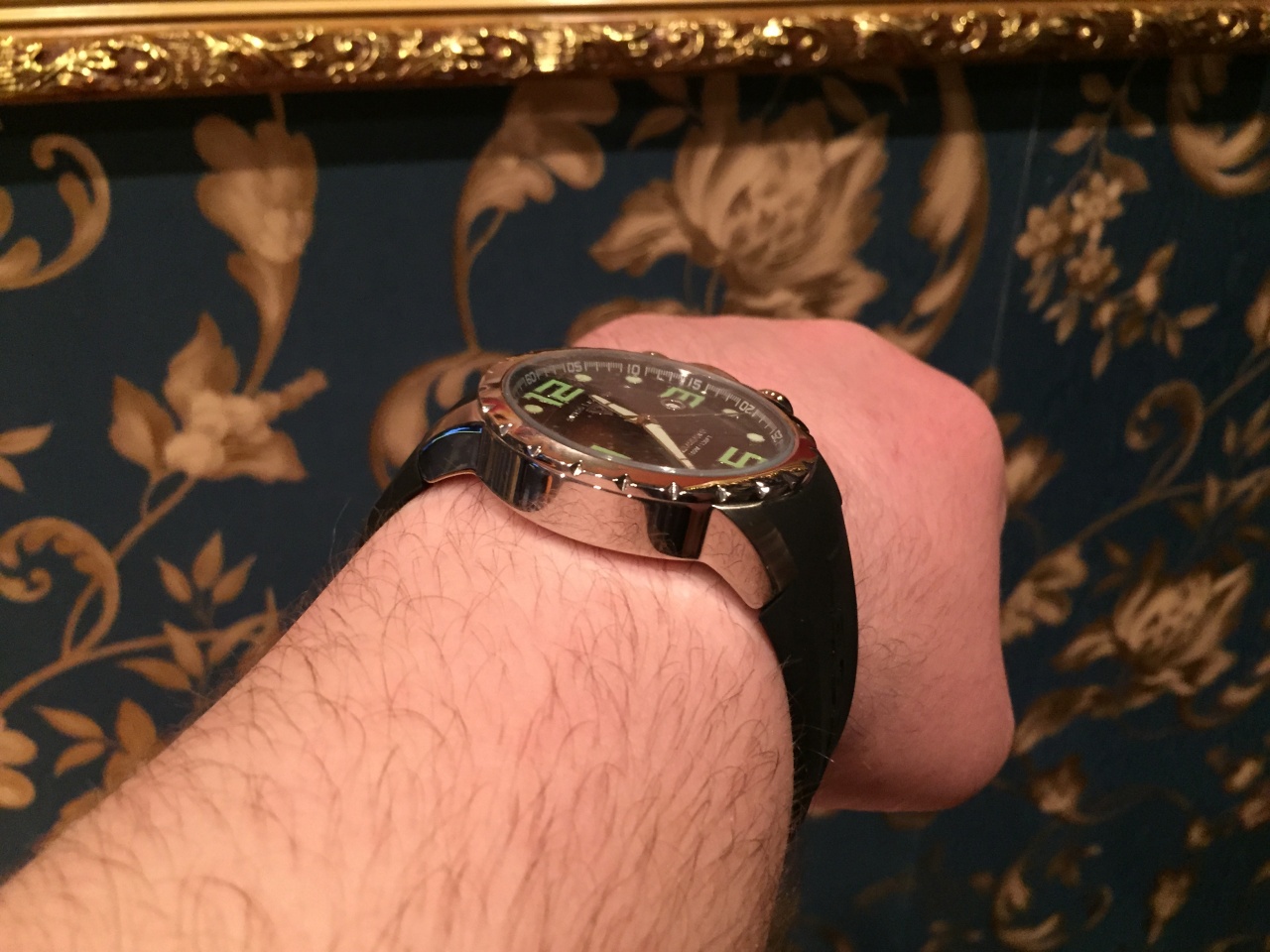 Антибликовый черный циферблат; цифры, метки и стрелки с крупными люмми полями.