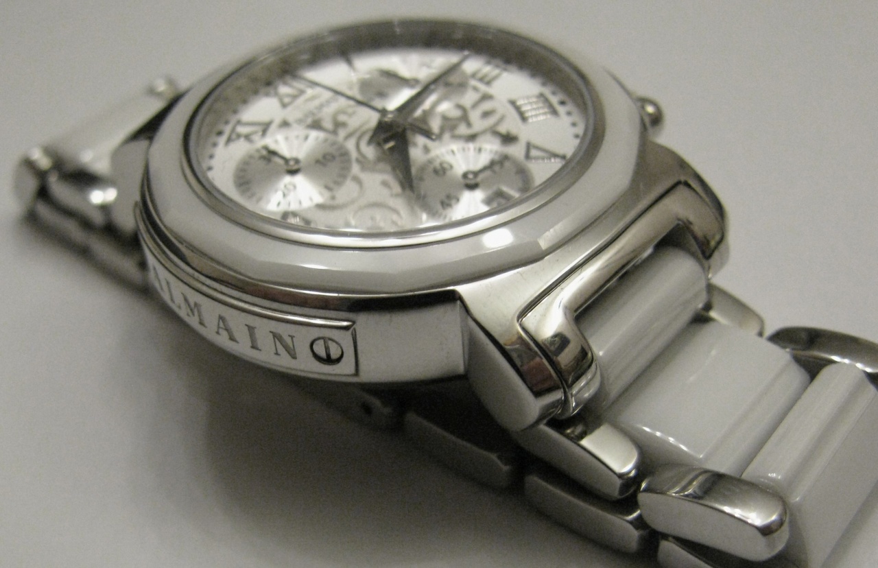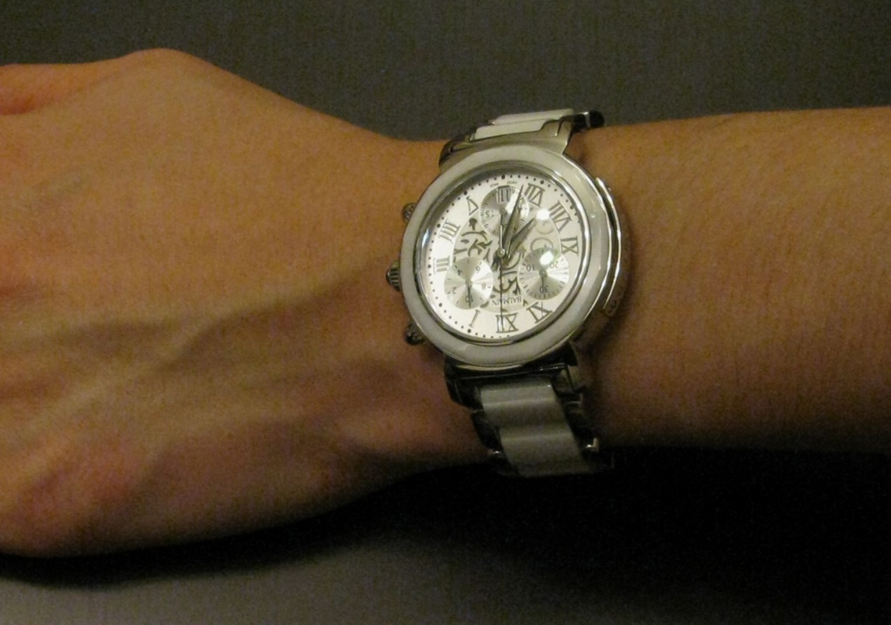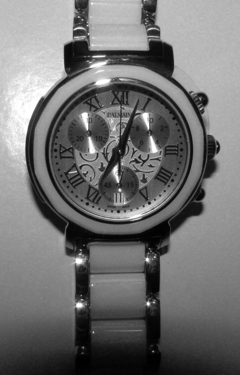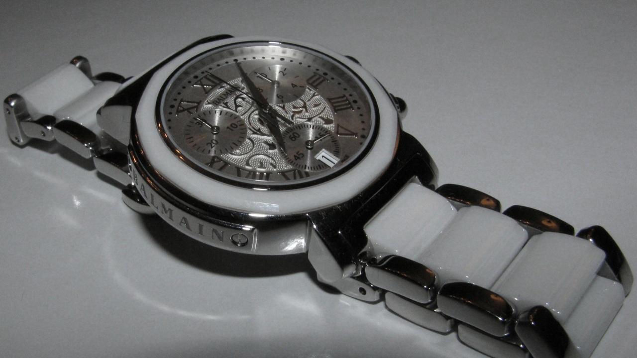 Предыстория такова, что жена захотела себе часы в канун НГ, посмотрела картинки в интернете и выбрала себе Tissot 28 мм с черным циферблатом на ремне. Модель не помню точно. Ну ладно, говорю, купим. Вот только давай зайдем в какой-нибудь магазин и посмотрим в живую, на руку примеряем. Зашли, одели на руку 28 мм и взяли 35 мм для сравнения. Жена говорит 28 не хочу. Маленькие. )) А я говорю, попробуй еще что-то повеселее, по наряднее, с белым циферблатом например. Взяли. Говорит мне, черное не хочу. )) Стали смотреть уже белые часы. А когда увидели эти - влюбились оба с первого взгляда. Циферблат потрясный, никакие фотки не смогут передать всю красоту узора арабески. Керамика модно и удобно, меньше царапается. Кварц практично, тем более, что носятся часы не каждый день. Ушли с магазина в задумчивом настроении. До этого дня про марку Balmain я никогда не слышал.