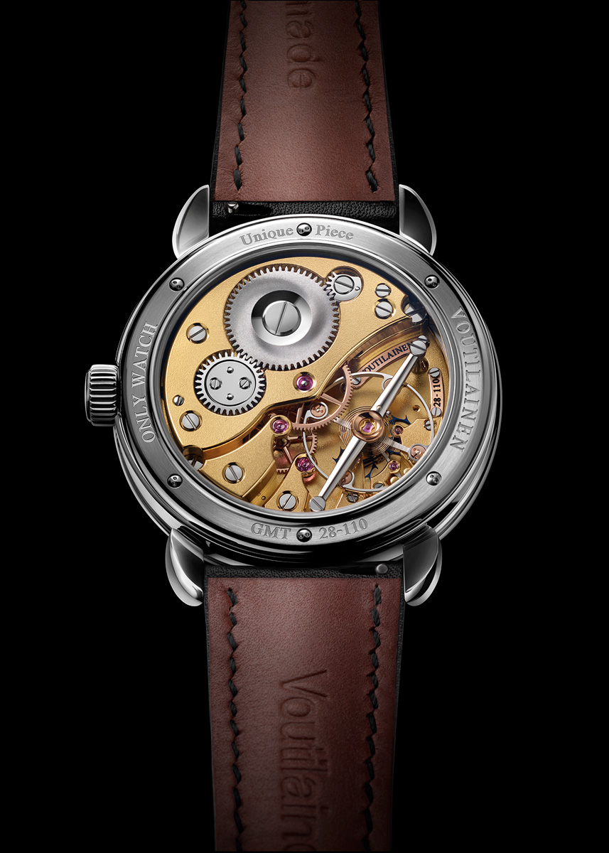 Новая уникальная модель GMT-6 for Only Watch 2015 от финской часовой компании Kari Voutilainen выпущена, как это и явствует из ее названия, для шестого по счету благотворительного аукциона Only Watch, который состоится 28 сентября текущего года в Женеве (этот аукцион проводится один раз в два года; все доходы от него идут на поддержку исследований мышечной дистрофии Дюшенна - заболевания, поражающего одного из 3500 мальчиков, всего около 250000 детей, подростков и молодых людей по всему миру; важно также отметить, что на торги принимаются исключительно модели Piece Unique; предварительно эти уникальные модели совершат мировое турне с остановками в Монако, Гонконге, Пекине, Нью-Йорке и Лондоне, с тем, чтобы с ними могли ознакомиться коллекционеры и любители часов из разных стран мира).
