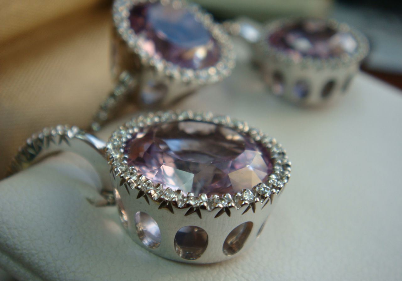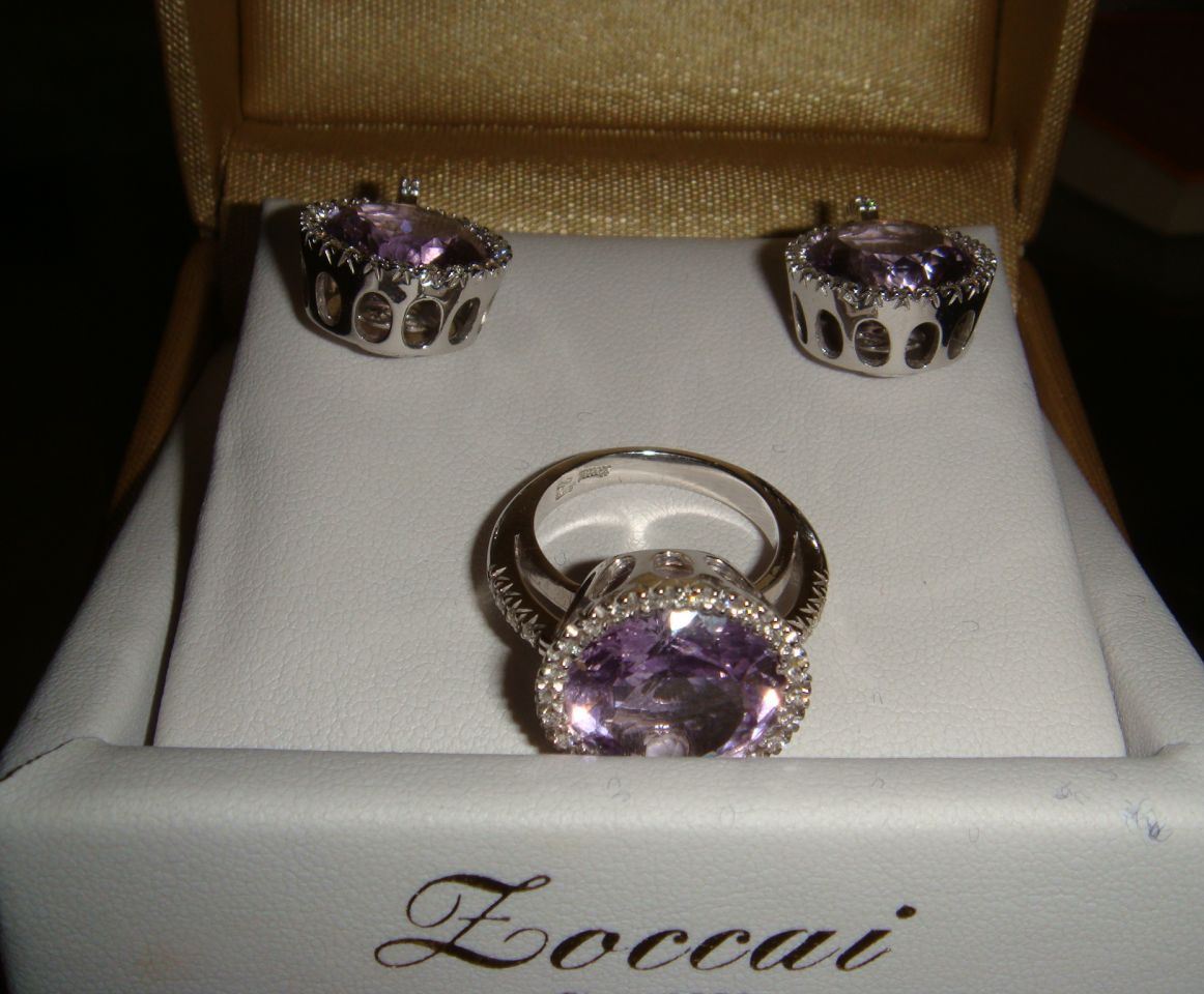 Великолепный набор из кольца и серёг от итальянского бренда Zoccai. Белое золото 18 К (750 пробы), три роскошных аметиста диаметром 15 мм и высотой 8 мм каждый, вокруг россыпь бриллиантов. Изделия 100 % оригинал, клеймо бренда можно увидеть с оборотной стороны кольца и серёг.