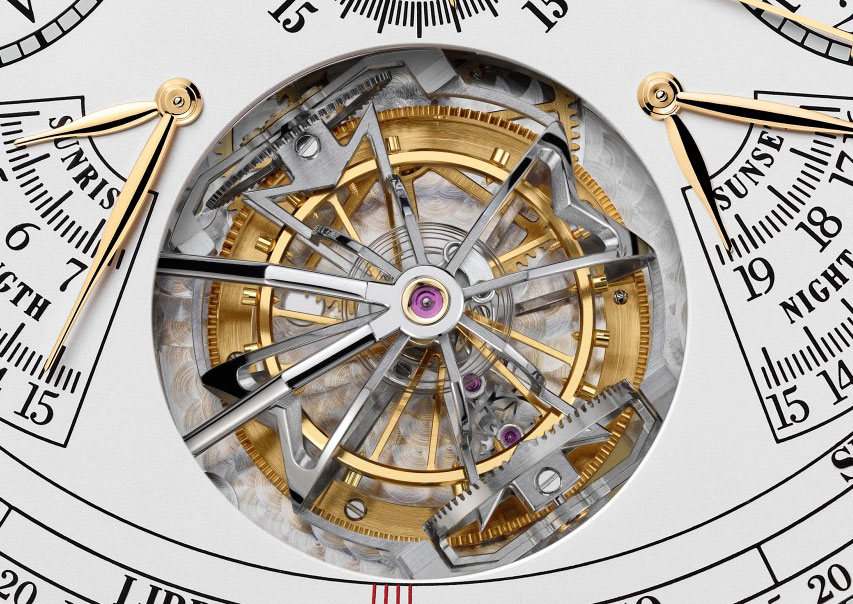 The sector above the tourbillion aperture indicates Equation of Time showing the discrepancy between true solar time and standard meantime which fluctuates during the year but can be ahead by as much as 16 minutes (around November 3rd) and behind by 14 minutes (around February 12th). Solar and meantime are equal on just four occasions each year. Flanking the tourbillon aperture are two dual sectors for the time of sunrise and day length and time of sunset and night length in the user’s home city. These indications are in fact another relevant factor in the Gregorian calendar in which the days are calculated from the hours of light and darkness and not strictly set times.
