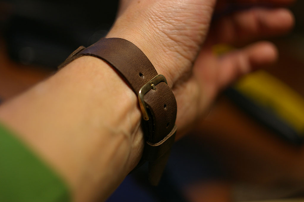 Смотрю эту тему и удивляюсь, сколько же умелых мастеров тут присутствует. Есть изделия, от которых я просто в восторге. Ну и мне захотелось изготовить простенький напульсник для простеньких часов. Покажу предварительный результат. Сразу вопросы, для полного фен-шуя необходимо прошить периметр или это нужно для двух-, многослойных ремешков? Как и чем красиво отрезать конец ремешка на длинной части? Достаточно одной шлевки или лучше две?