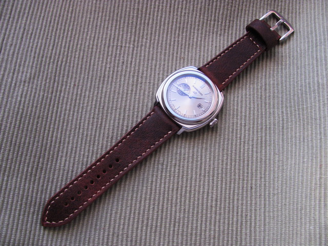 собственно вот моя история. Дождался превосходный ремешок от Влада и зачесались руки шаловливые, которые в наборе с дурной головой дают иногда интересный результат. На месте "черной луны" должен был быть оттиск пятицентовика. Перегрел монету и переусердствовал с оттиском. Сказалось отсутствие опыта тавроставителя Конечно сначала потренировался на старом ремне, но там грел над свечкой - монета закоптилась, во избежание оного перешел на сухое горючее - температура пламени выше как итог обугливание В итоге чуть хайер на себе не повыдергивал весь. Больше всего было неудобно перед Владом "как я теперь такое ему покажу здесь?!" Но...отскоблил золу, пропитал касторкой, навощил..... интересная блямба получилась, фактурная, винтажным часикам на мой взгляд идет. Однозначно буду носить с гордостью и жду от Влада нового подопытного (пятицентовик я все ж таки тисну)