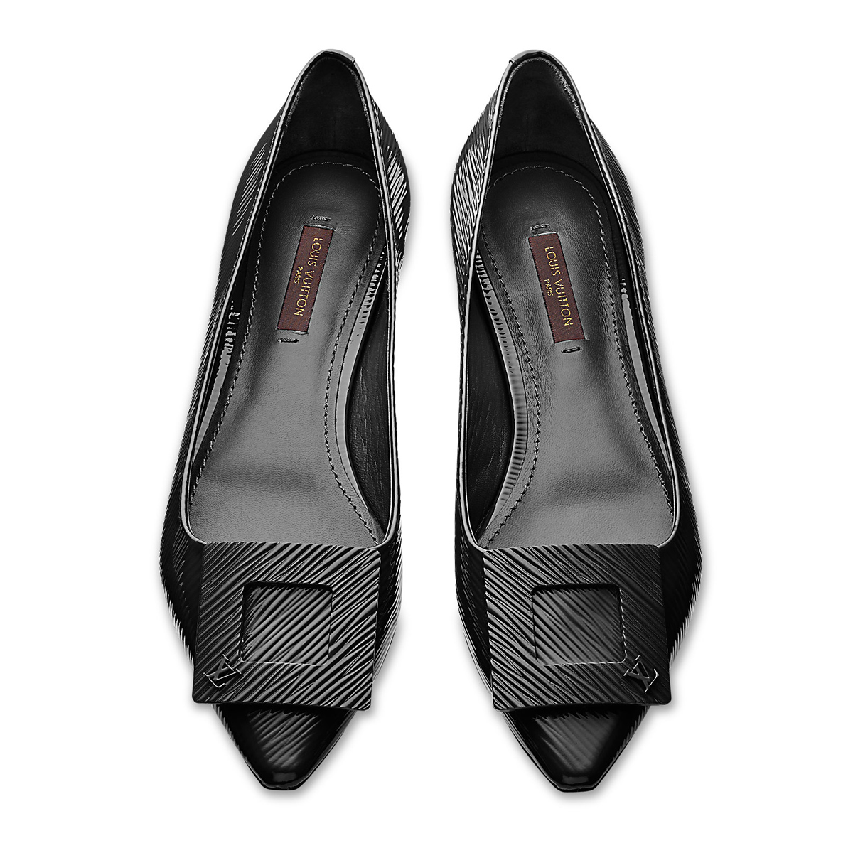 "Эти стильные балетки в актуальном стиле шестидесятых годов из роскошной лакированной кожи теленка Epi дополнены элегантным квадратным аксессуаром в тон кожи, имитирующим характерную текстуру кожи Epi."