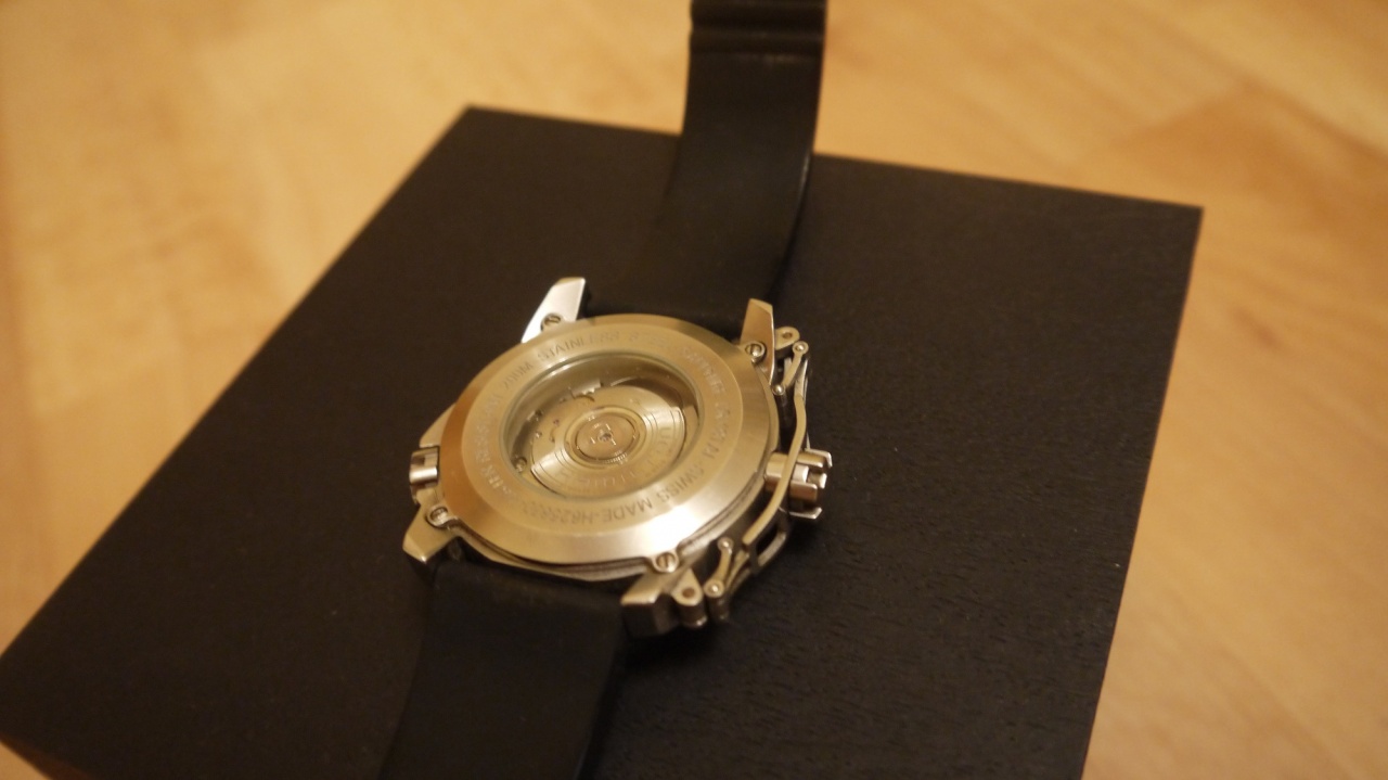 Мужской размер - 44мм, но за счет скобы и двух заводных головок ощущаются еще больше. Корпус очень надежный и гармоничный.