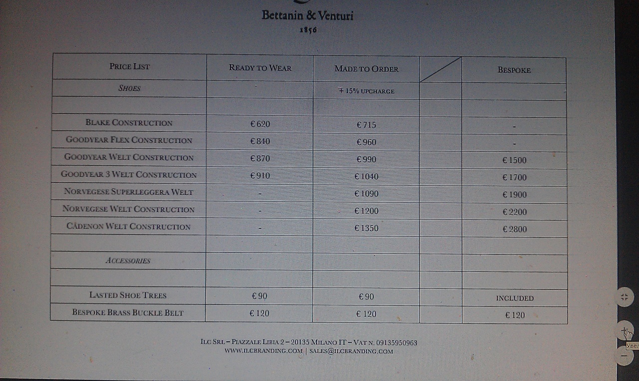 Bettanin & Venturi. Под своим брэндом с 1994 г., до этого, насколько знаю, работали с Branchini. Доступны blake, goodyear, norwegese, cadenon. Напрямую не торгуют, цены устанавливают сами магазины. К заказу(+15%) доступны любые модели, выбор цвета, кожи, конструкции, просто кидаете фото - объявляют цену. Прайс прилагаю итальянского магазина, цены с австрийским магазином на заказы примерно одинаковые. Сроки изготовления 6-8 недель, в итальянском возможна предоплата заказа 50%,остальные 50% перед отправкой. Нажмите на изображение для увеличения