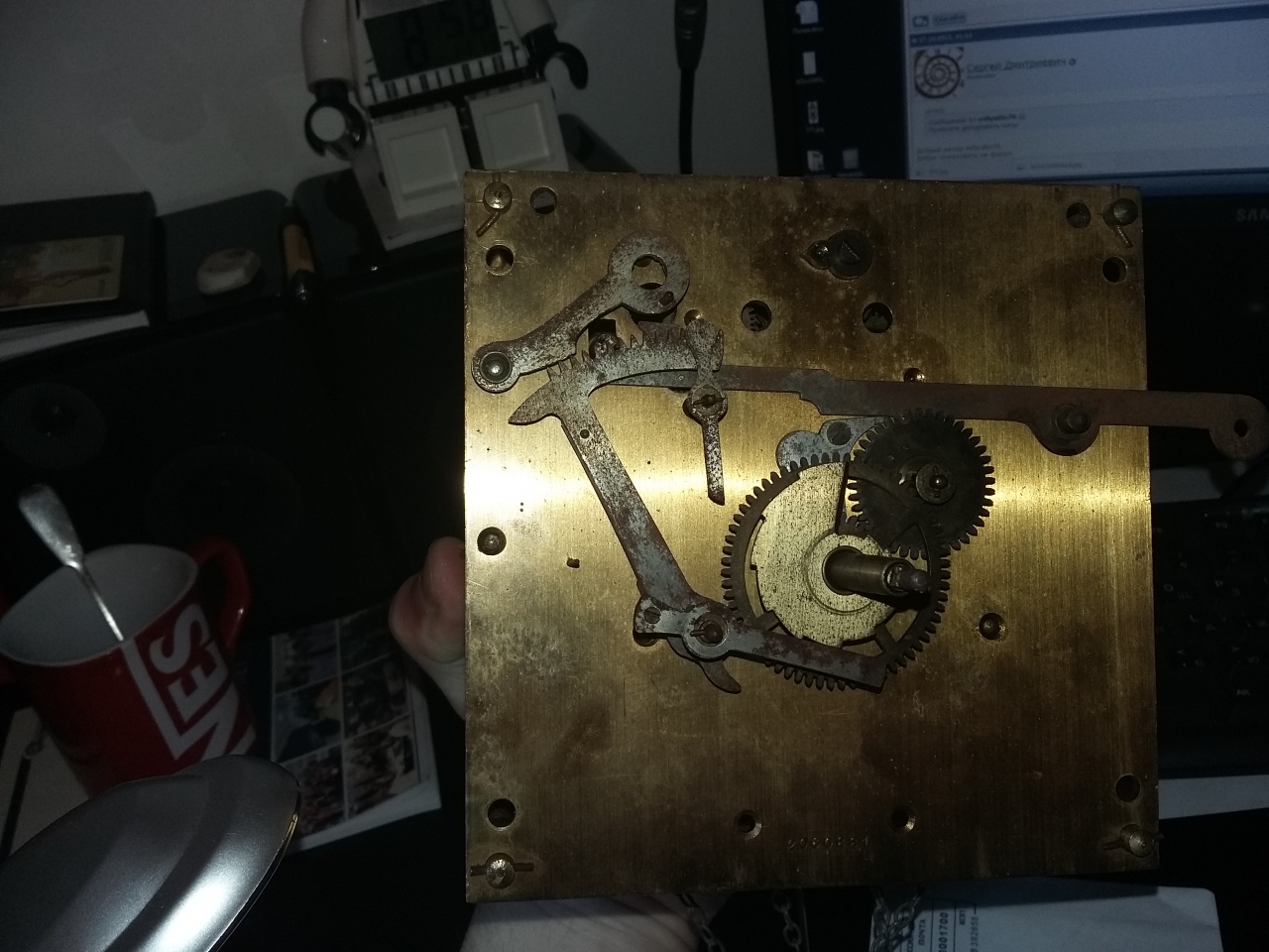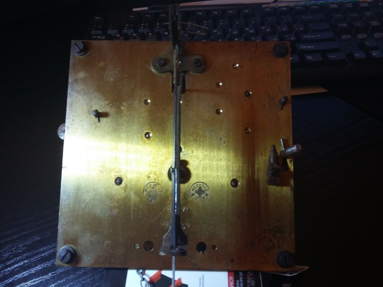 Здравствуйте. Есть вот такой механизм от напольных часов. Помогите пожалуйста определить год и прошу подсказать, как можно узнать нужную длину маятника и массу грузиков. Спасибо.