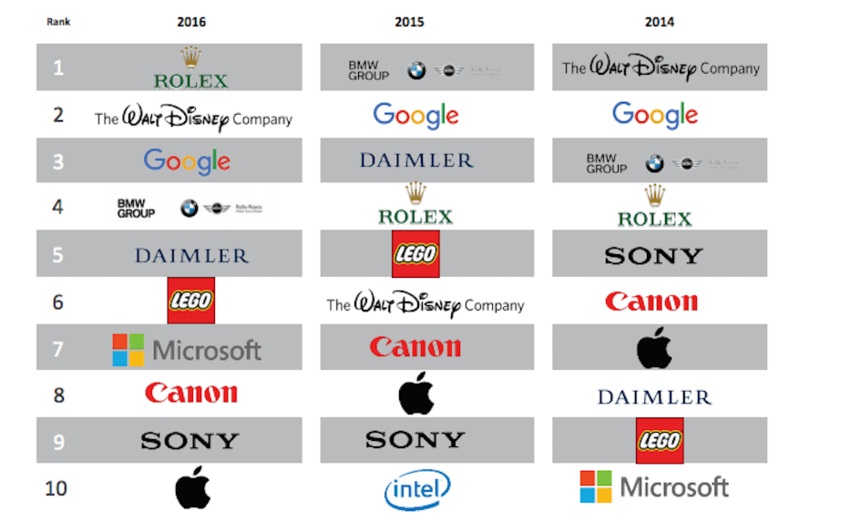 В течение года фирма Reputation Institute, штаб-квартиры которой находятся в Нью-Йорке и Копенгагене, публикует региональные рейтинги, а весенней порой представляет список компаний, которые имеют наилучшую репутацию в мире. В особенности швейцарский бренд отличился в области часов, которые спустя 111 лет после создания компании продолжают удивлять клиентов своим качеством и инновационным характером. Вероятно, немалое влияние на умы потребителей оказал и тот факт, что с июля 2015 года Rolex, ежедневно продающий около двух тысяч часов во всем мире, дает пятилетнюю гарантию на все свои модели, увеличив ее срок в два с половиной раза. Что же до ближайших соперников за место мирового лидера, то Google получила третье место за экономические показатели деятельности и условия работы, Apple – за лидерство и инновации, а Disney – за управление и сознание гражданского долга.