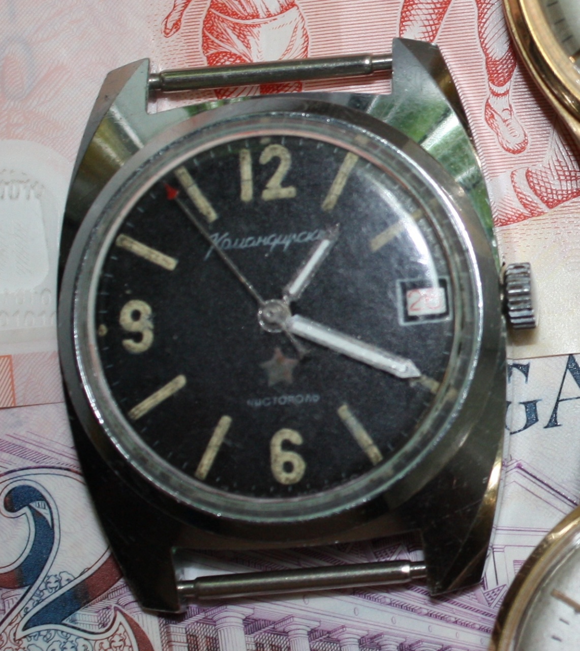 Даже и не знаю , сердится ли на горькую свою судьбу или радоваться. Отправился сегодня на толкучку, ничего замечательного не нашел, и стал уже примериваться к командирским дальней авиации, как вдруг- вот это вот чудо. И всего за 500 руб. Естественно , мгновенно закупил , и бегом на репассаж. А там запросили аж 1300. И тут мну осознал, что такие часы он по таким ценам носить не будет.В общем, решил сменить стекло , недельку побаловаться и отложить. И что самое обидное, меня на востоки какой-то злой рок бьет, всегда как восток - так рядом что-то или красивей,или дешевле или редкостней ..