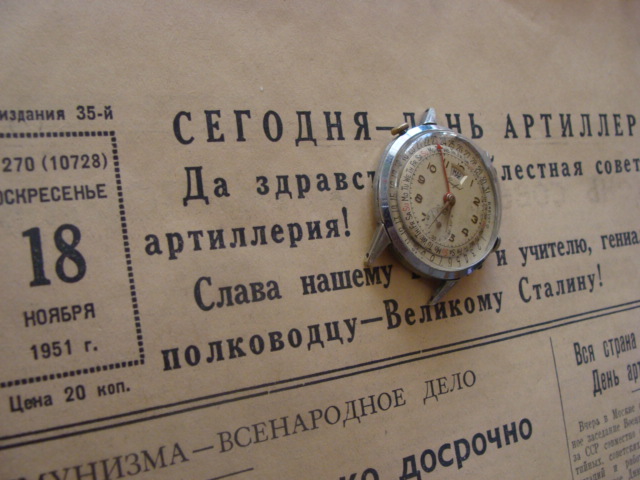 Однако на качество часов это не влияет, они безупречны и на отличном ходу. Бонусом к часам идет газета Известия от 18 ноября 1951г. где наш главный герой упоминается в суе.