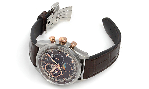 Материал корпуса: Стальной; Размер корпуса: 45 мм; Тип механизма: Механический хронограф с автоподзаводом; Калибр: El Primero 4047; Запас хода: 50 часов; Функции: Часы, минуты, секунды, дата, хронограф, фазы луны и солнца; Водонепроницаемость: 50 м; Браслет: Из кожи аллигатора; Цвет ремешка: Коричневый