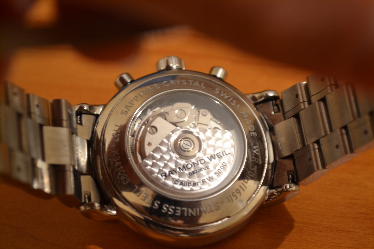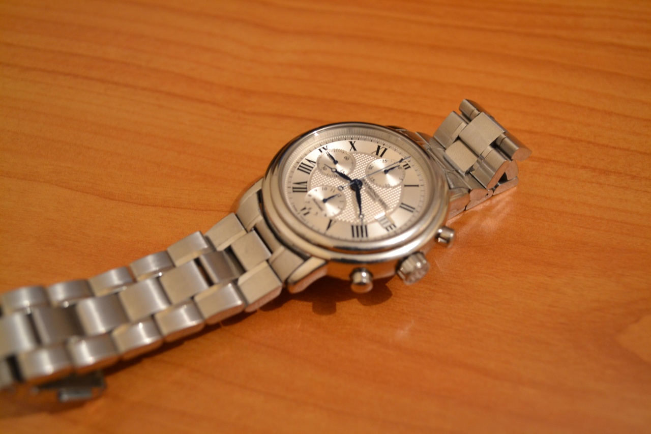 Механический хронограф с секундомером и автоподзаводом, запас хода 46 часов. Индикация числа. Сапфировое стекло с антибликовым покрытием. Кожаный ремешок. Диаметр корпуса 41,5 мм.