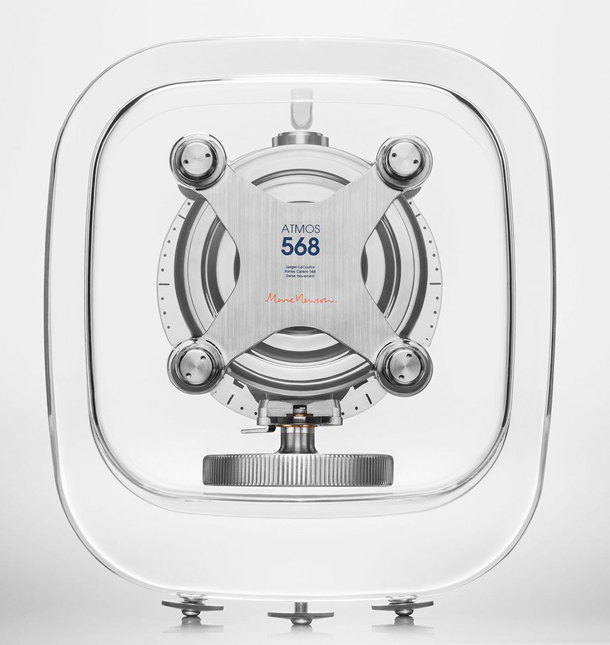 Atmos 568 – это настольные часы, которые отображают время, месяц и текущую фазу луны. Конструкция помещена в корпус из стекла Baccarat, механизм размещен в центре. Калибр 568 собран из 211 деталей. Финишная отделка механизма отличается высокой эстетикой, в общий дизайн внедрено крупное балансовое колесо.