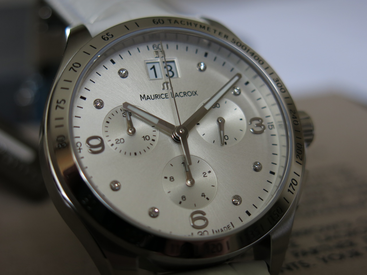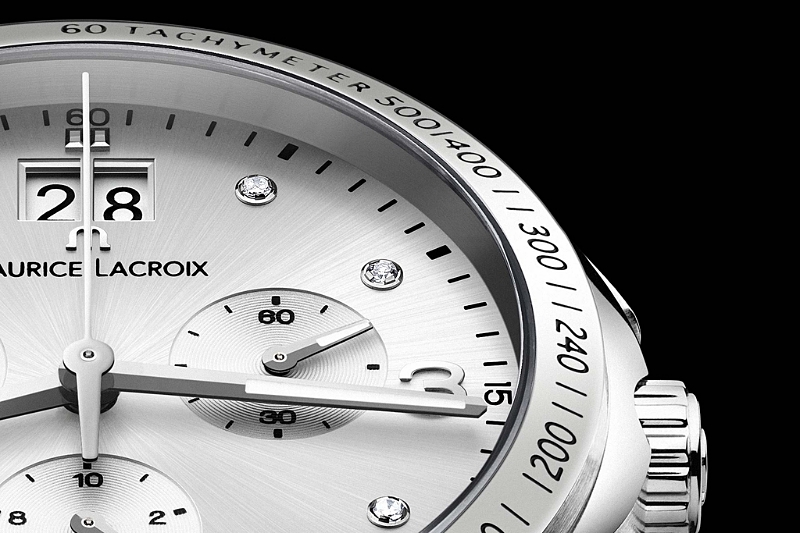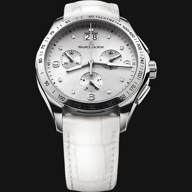 Циферблат: Серебристый сатинированный с большой датой, украшен 8 метками бриллиантами общим весом 0,04 K, Люминесцентные стрелки