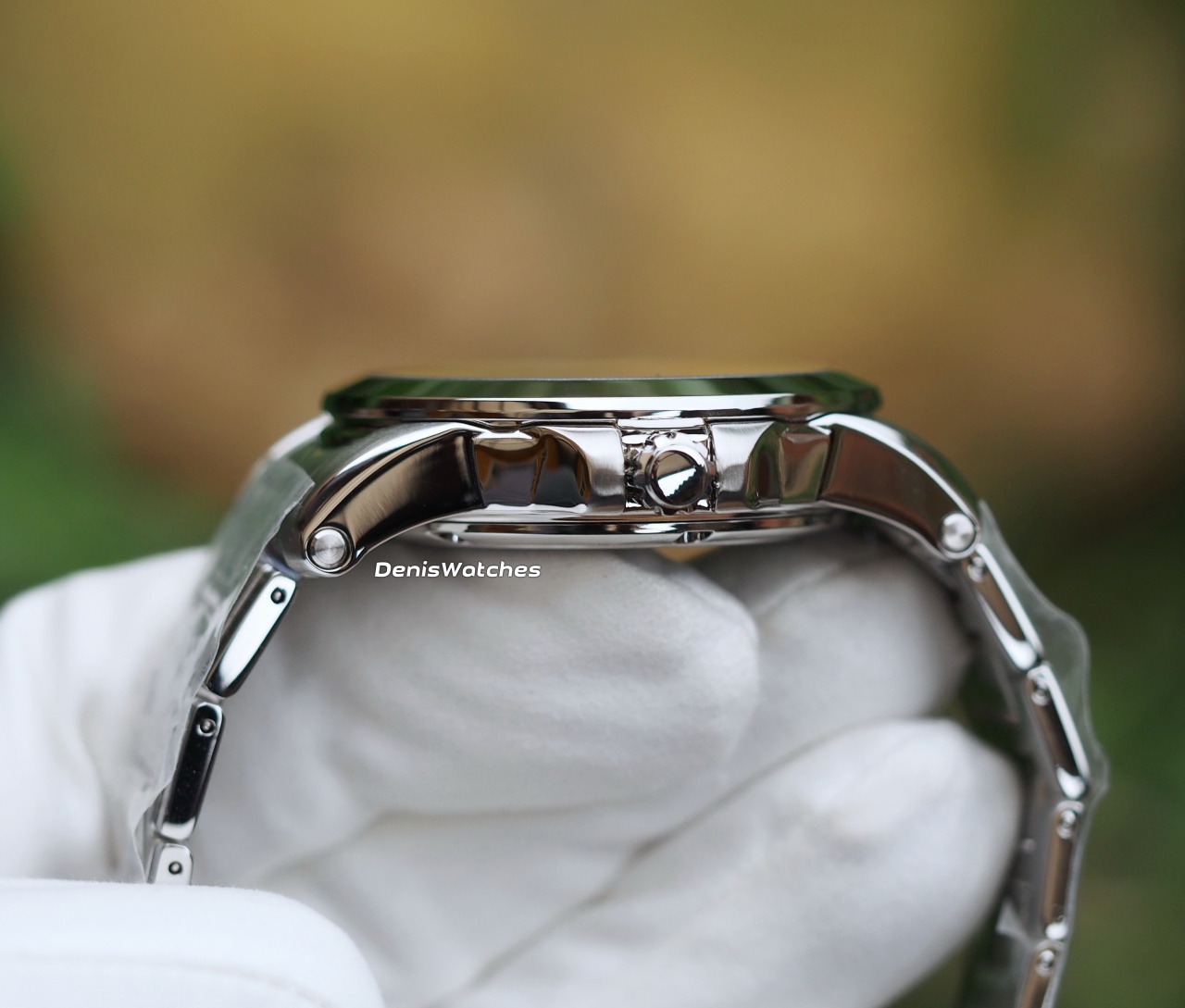 Стальной корпус, сатин + полировка, защитные выступы у заводной головки