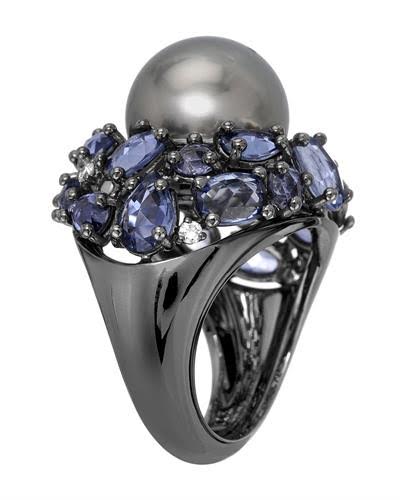 Кольцо UTOPIA коллекция CONCERTO с черной жемчужиной и синими сапфирами.