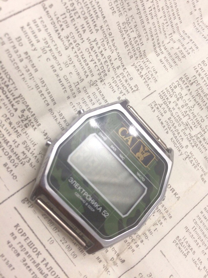 Были найдены интересные часы(ЭЛЕКТРОНИКА 52).Не тронутые в оригинальной коробочке и подлинными документами но с интересным дизайном в военном стиле также сверху надпись СА(СОВЕТСКАЯ АРМИЯ).