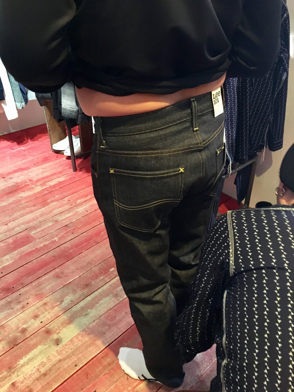 Зеркал в кабинках нет, света мало и очень мало в том месте где примерочная. Отцу сказал так - выбираю что тебе купить я, а ты просто меряешь о говоришь свои ощущения. Потому что после примерки самураев он сказал "валим отсюда это какая-то роба, я не могу ее застегнуть в ширинке" В итоге удалось убедить купить lee101 14oz кажется. Сели хорошо. Немного поносит и сделаю фото. Сами штаны к слову не впечатлили, заклепок в карманах нет. На патче шов расходится, но для начала пойдет. Себе без особой нужды прикупил 777s21 в 30 размере, пусть лежат, может доберусь со временем. Чек за все составил 460 евро кажется.