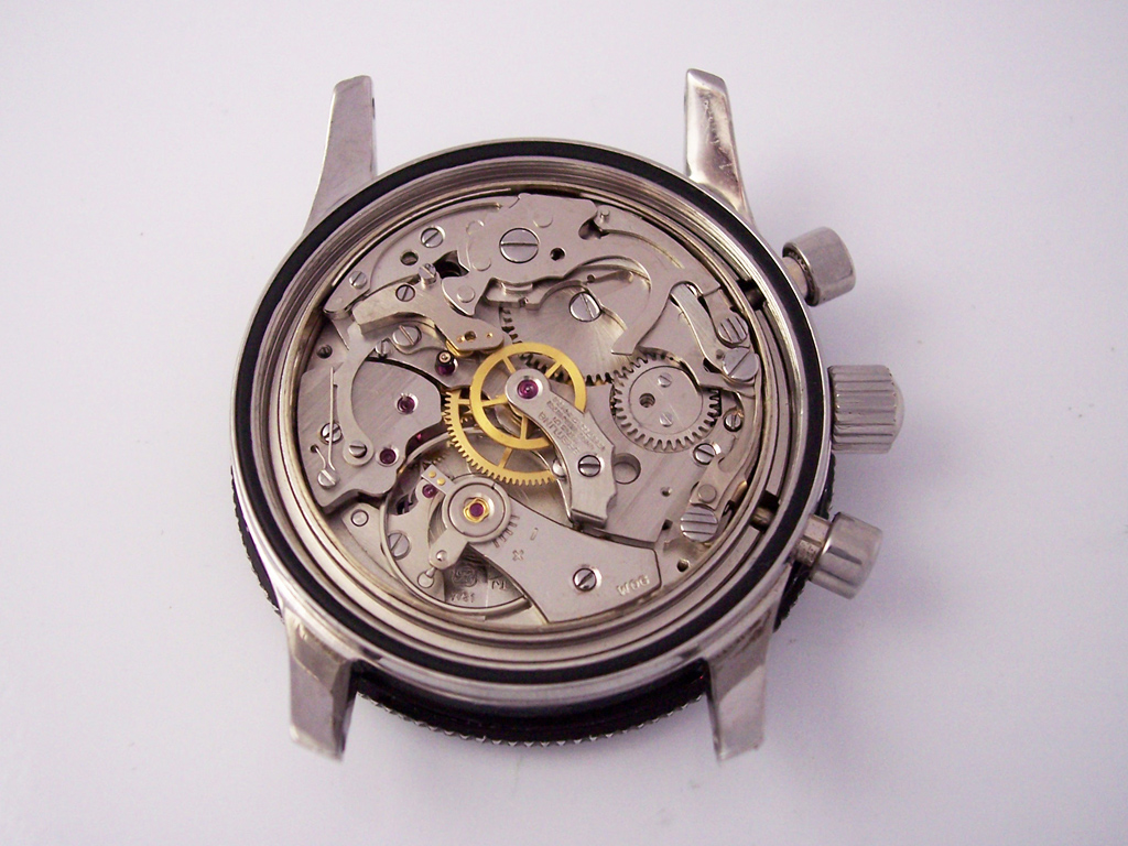 Но самые главные изменения внутри. Теперь в эту модель установлен модифицированный механизм хронографа Venus 188. Как уже сказано выше, хронограф имеет лишь одну стрелку – центральную, для подсчета минут. При этому индикатор над 6 часами указывает с помощью цвета, активирован хронограф или нет (белый – включен, белая точка в центре – остановлен, черный - сброшен).