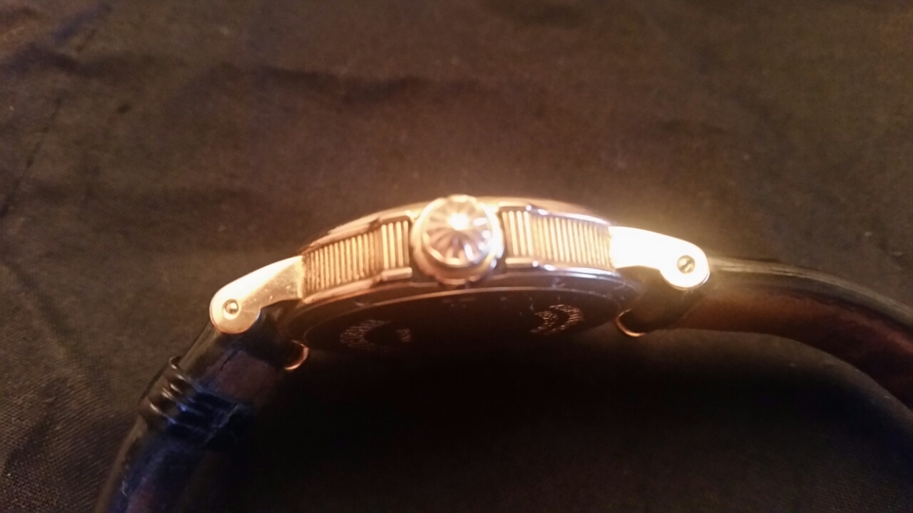 Циферблат выполнен из посеребренного золота с нанесенным вручную узором гильйоше.