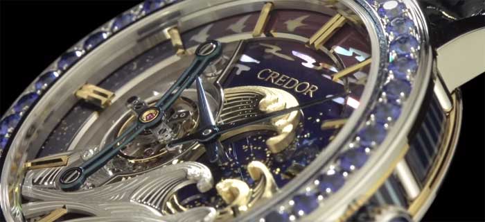 Циферблат Credor Fugaku Tourbillon, выполненный из золота, перламутра, яко-гаи (кусочков раковины гигантского морского моллюска Turbo marmoratus) и украшена лаком Уруши, можно назвать современной интерпретацией знаменитой «Большой волны в Канагаве» — одной из цветных гравюр по дереву из серии «Тридцать шесть видов Фудзи» японского мастера Кацусики Хокусая (к слову, Фугаку — «Вершина Фудзи» — это одно из поэтических наименований священной для японцев горы).