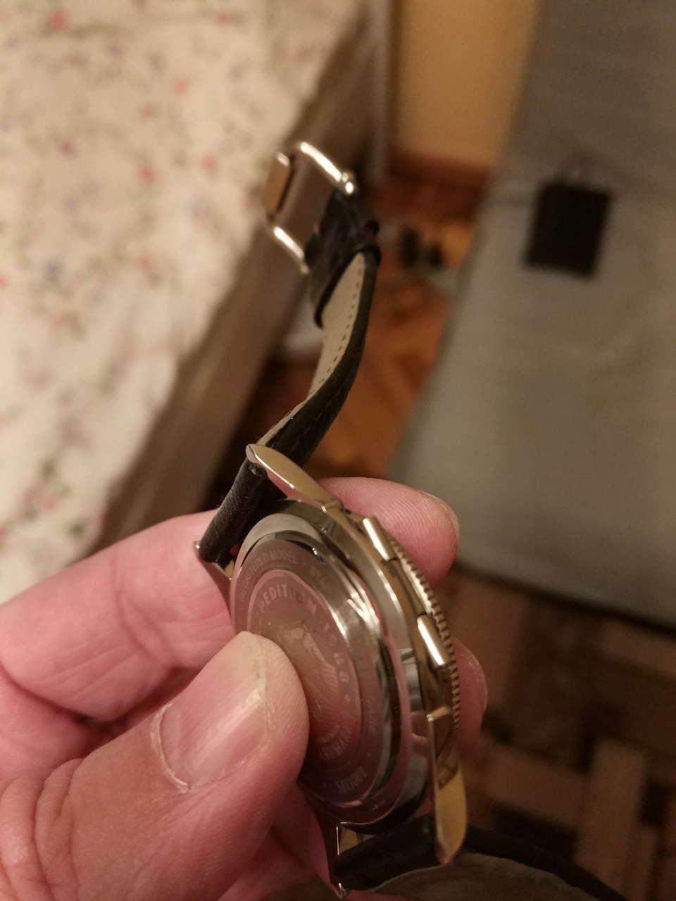 Теперь к часам. Часы - NOS (new old stock). Это настоящая Швейцария, во всех смыслах (соответствующие клейма присутствуют и на цифере, а на задней крышке). Часы оснащены двойным корпусом, верхний из которых имеет крышку с апертурой. Особенностью часов является наличие солнечного компаса. Оснащены эти чудные часики.высокоточным кварцевым механизмом от лидера по производству часовых механизмов - ETA калибра 955,122 T. Cтрелка компаса, она же GMT. Часовая стрелка направляется на солнце, при этом компас на внутреннем диске показывает стороны света. На задней крышке - гравировка вершины Лотсе в Гималаях. Часы поставляются в дорожном чехле, отличном небесполезном аксессуаре. Это не часы, это - игрушка, их не хочется выпускать из рук.Резюмируем: часы со своей историей, на отличнейшем механизме, с двумя сапфировыми стеклами, с добротнейшим ремешком из акулы, про дизайн вообще молчу) Отличнейший экземпляр в коллекцию!