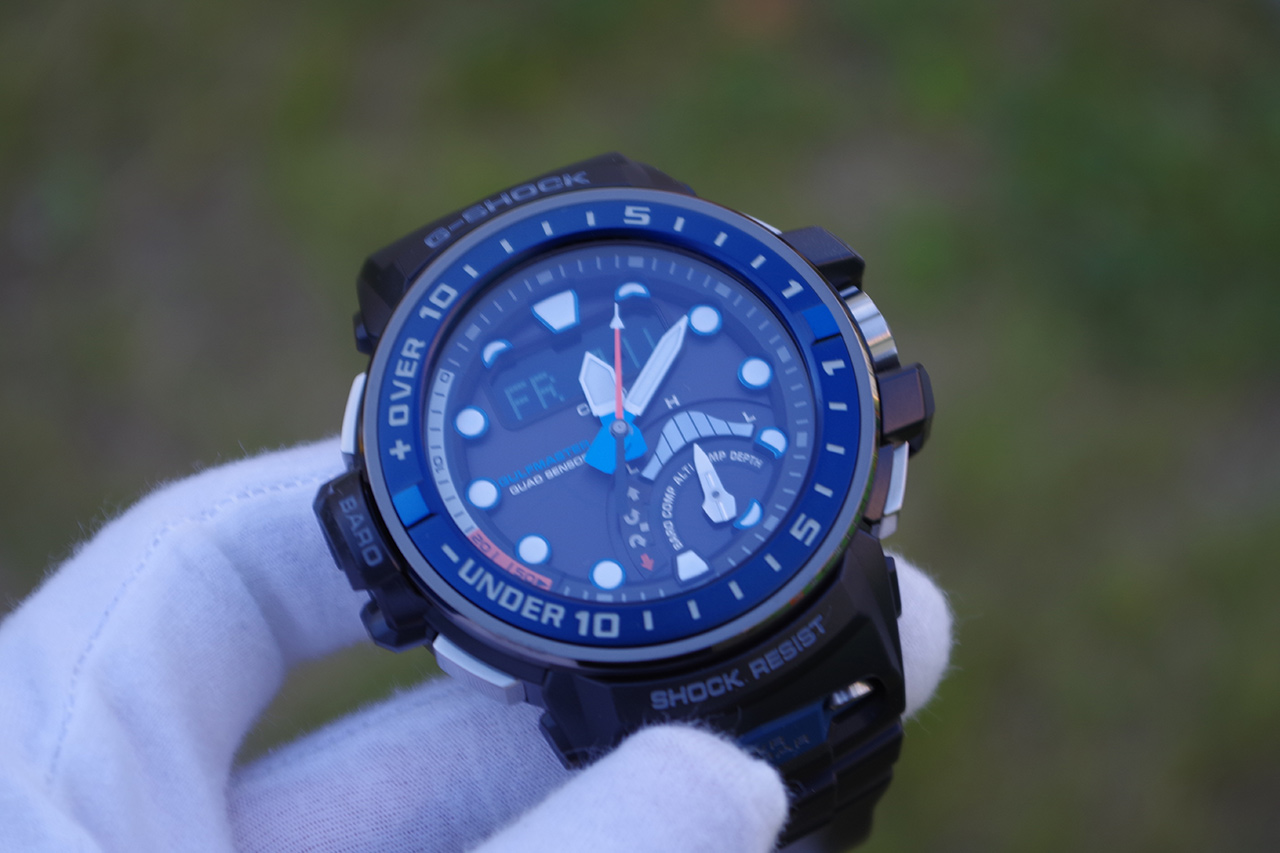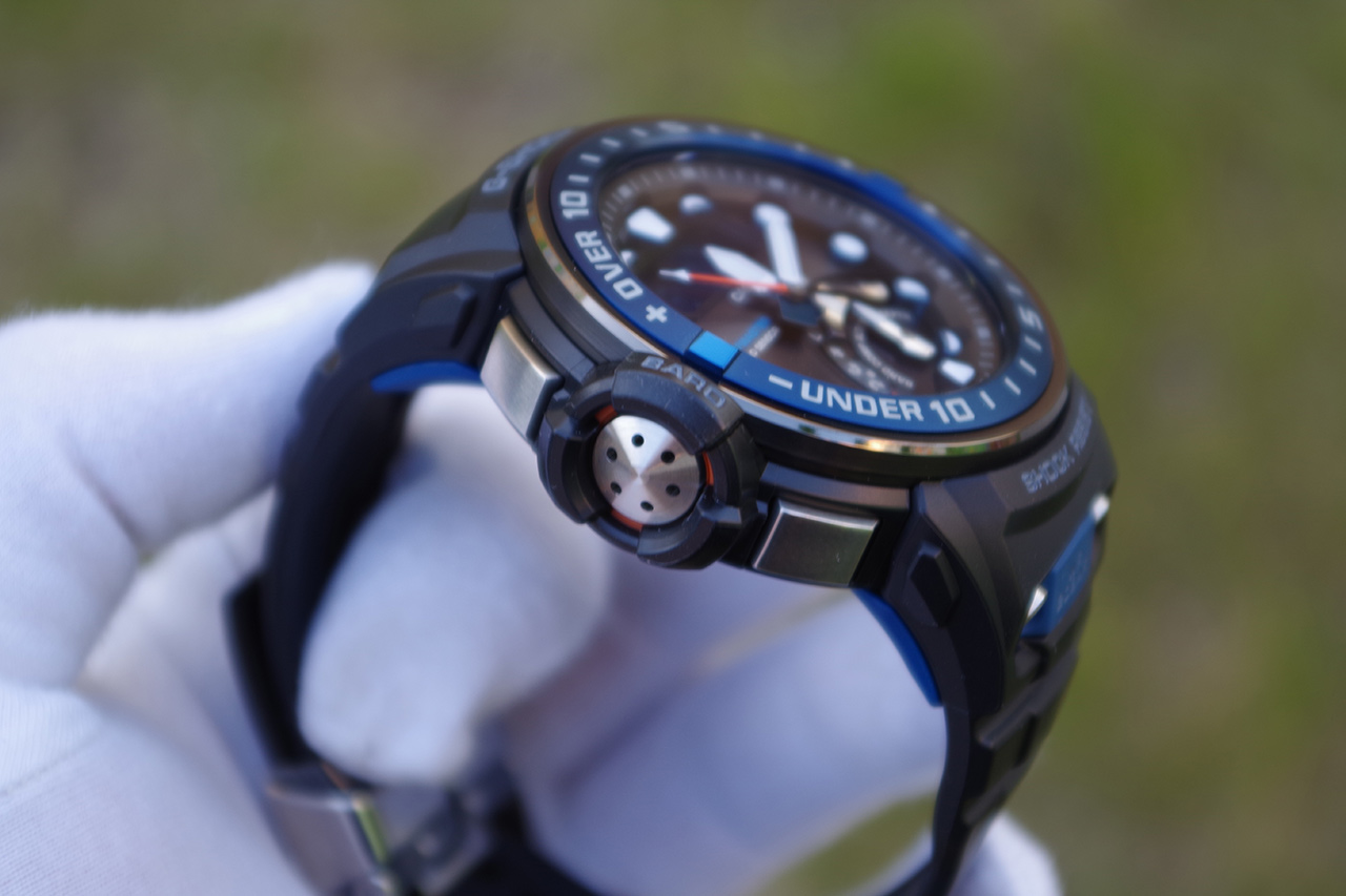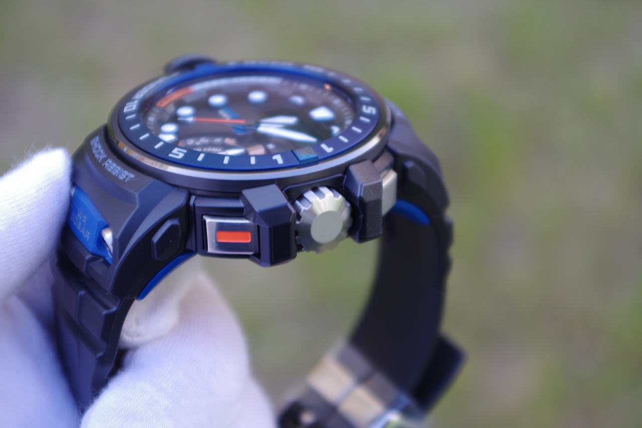 Gulfmaster. Питание от солнечной энергии Tough Solar - солнечные батарейки большой мощности, индикатор заряда батареи. Функция автоматического сохранения энергии. Время работы аккумулятора без подзарядки до 6 месяцев, при включенной функции сохранения энергии до 21 месяца. Противоударный корпус защищает механизм от ударов и вибрации. Циферблат и ЖК дисплей подсвечиваются ярким светодиодом, при недостаточном освещении во время поворота запястья в сторону лица подсветка включается автоматически. Светонакопительное покрытие Neobrite продолжает светиться в темноте даже после непродолжительного пребывания на свету. Технология Multi Band 6 позволяет принимать сигналы от шести радио вышек, расположенных в различных точках земного шара, которые передают временные сигналы от определенных атомных часов. Коррекция текущего времени радиосигналом на территории почти всей Европы, США, Японии и Китая. Функция автоматической коррекции положения стрелок проверяет положение стрелок каждый час и корректирует его в случае необходимости. Технология Quad Sensor позволяет точно и легко определять сторону света, температуру, атмосферное давление/высоту и глубину. Встроенный цифровой компас. Диапазон измерения от 0° до 359° с точностью 1°. Коррекция магнитного склонения. Встроенный датчик температуры от -10° до +60°С с точностью 0,1°C. Барометр - измерение атмосферного давления от 260 до 1100 гПа (от 195 до 825 мм рт. ст.). Высотомер - встроенный датчик барометрического давления с возможностью вывода результатов в единицах высоты над уровнем моря (от -700 до 10000 метров). Глубиномер до -50м, точностью 10см. Автоматический запуск и остановка измерений на глубине 1м. Журнал аквалангиста до 40 записей времени начала погружения, длительности погружения и температуры воды. Система Smart Access с помощью электронной заводной головки обеспечивает простой и удобный доступ ко всем важным функциям часов. Нажатие или поворот заводной головки позволяет переключаться между различными режимами и активировать будильник, таймер, секундомер, а также настраивать функцию мирового времени. Отображение возраста и фазы Луны. Графическое отображение сведений о приливах и отливах на заданную дату и время. Мировое время – 48 городов (31 часовой пояс), всемирное координированное время (UTC). Автоматический переход на зимнее и летнее время, возможность включения/отключения данной функции. Время восхода и захода Солнца. 12-ти и 24-х часовой формат времени. Секундомер с точностью показаний 1/100с и временем измерения 24ч. Сплит-хронограф. Таймер обратного отсчета от 1мин до 1ч. Функция включения/отключения звука. Стальной безель с IP покрытием. Завинчивающаяся заводная головка с защитой.