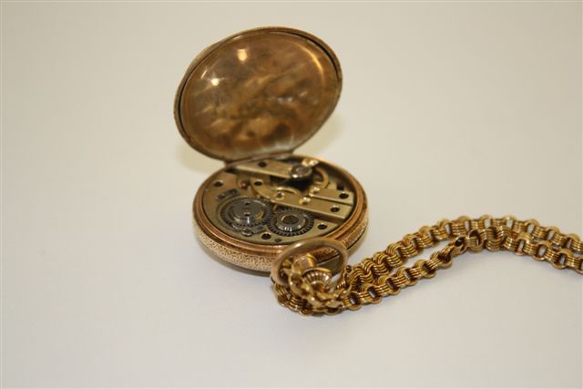 Опознать этот "цилиндр" довольно проблематично. Отсутствуют серьезные "зацепки" позволяющие отнести их к какой -либо именитой фирме. На кейсе присутствует швейцарское пробирное клеймо "белка" дважды "оно же закорючка". Присутствует немецкое общенациональное клеймо "корона" для обозначения изделий из золота. Кейс т.о. произведен в Швейцарии и поставлен затем в Германию вполне возможно, что отдельно от механизма. Механизм -5-ти мостовой "цилиндр" " швейцарской школы" среднего класса на 10 камнях, но с применявшимся максимум до 1910 года устаревшим механизмом перевода стрелок (нижняя возрастная граница этих часов 1896 год). Регулятор хода кто-то резко отвел за пределы градусника.