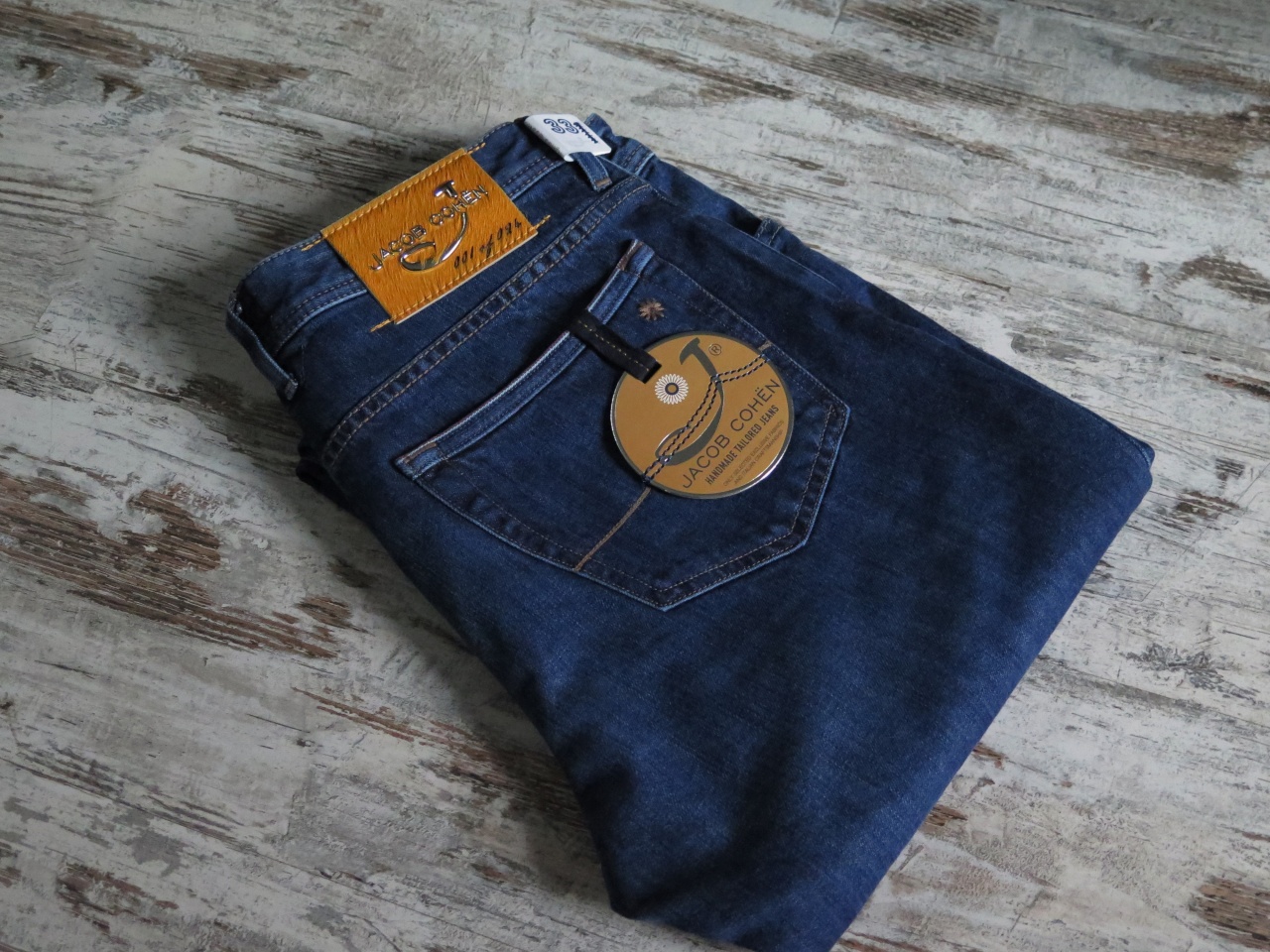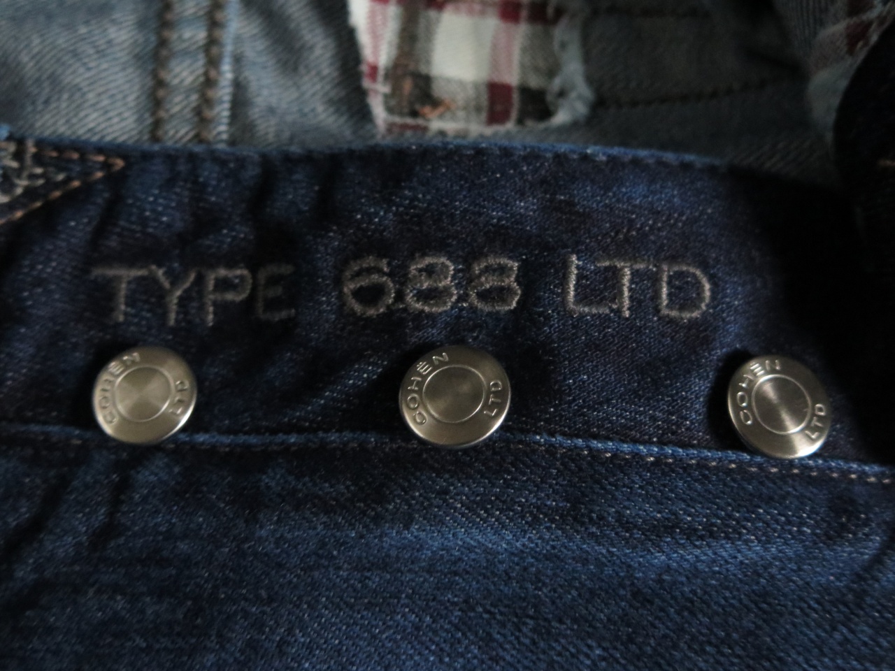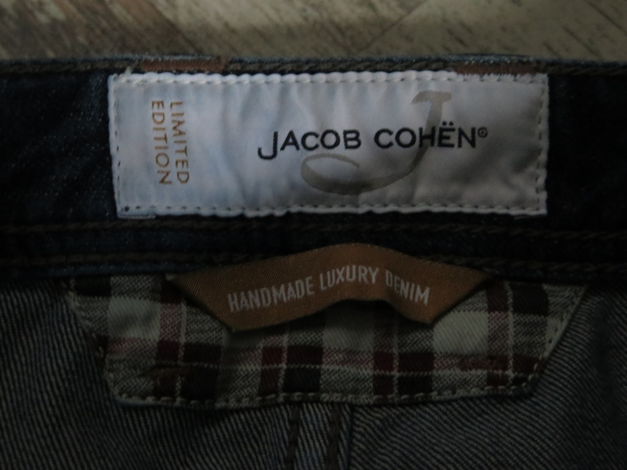 Сзади на правом бедре джинсы имеют фирменный ярлык из кожи пони жёлтого цвета с логотипом марки Jасоb Соhёn, выполненный из металла, что указывает на принадлежность к "лимитированной" линейке марки и порядковый номер -001